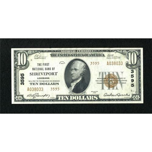 <B>Shreveport, LA</B></I> - $10 1929 Ty. 2 <B>The First NB</B></I> Ch. # 3595<BR> Tons of embossing remains visible on this note that was folded three times. One of the nicer circulated examples from here. <B>Extremely Fine+.</B></I><BR><BR><b>Shipping:</b> Coins & Currency (<a target="_blank" href="http://www.heritageauctions.com/common/shipping.php">view shipping information</a>)