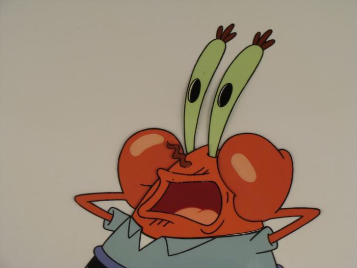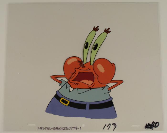 This original animation cel is from the Nickelodeon TV show SpongeBob Squarepants. The story takes place under the deep blue sea in Bikini Bottom, where SpongeBob resides. SpongeBob, who is a yellow, porous sponge, is your typical happy-go-lucky character, as he is always cheerful and enjoys making people laugh. Patrick Star, SpongeBob's neighbor who is a starfish, is your average children's show idiot, as he boasts knowing nothing and is often getting himself into ridiculous situations. Between the homes of these two lies the home of the miserable Squidward, a squid, who is known for being grouchy and playing tricks on SpongeBob and Patrick. Both SpongeBob and Squidward work at the Krusty Krab, a fast food business run by the greedy money-loving Mr. Krabs, a crab, the arch rival of the evil, possibly misunderstood, Plankton. Another neighbor, Sandy Cheeks, an athletic squirrel who normally wears an astronaut's space suit, was introduced in "Tea at the Treedome." She spends most of her time inventing and experimenting. Here Mr. Krabs appears to be shrieking at something or someone.Original Production Animated Cel Overall Size of Cel: 10 1/2" x 12 1/2" Excellent ConditionThis is an original hand-painted cel set-up used in the production of an episode of "SpongeBob SquarePants." Each one-of-a-kind set-up represents a slight change in position of the characters. When individually photographed and projected in rapid succession, the images appear to move.
