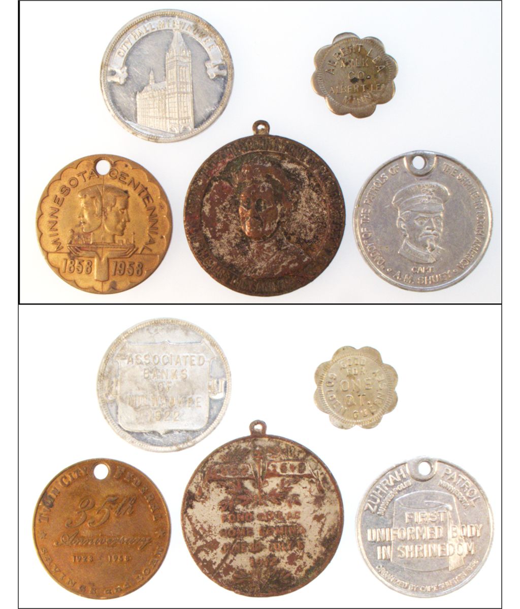 Minneapolis, MN- Capt. A.M. Shuey 1st Shrine Uniformed Patrol (aluminium, holed) 2.) Albert Lea, MN- Milk Co. GF 1 QT. (scalloped) 3.) Twin City Federal- MINNESOTA CENTENNIAL 1958 4.) Wisconsin Pair- Assoc. Banks of Milwaukee 1922/City Hall (aluminium) & 1st White Child Born in Fond Du Loc 1912