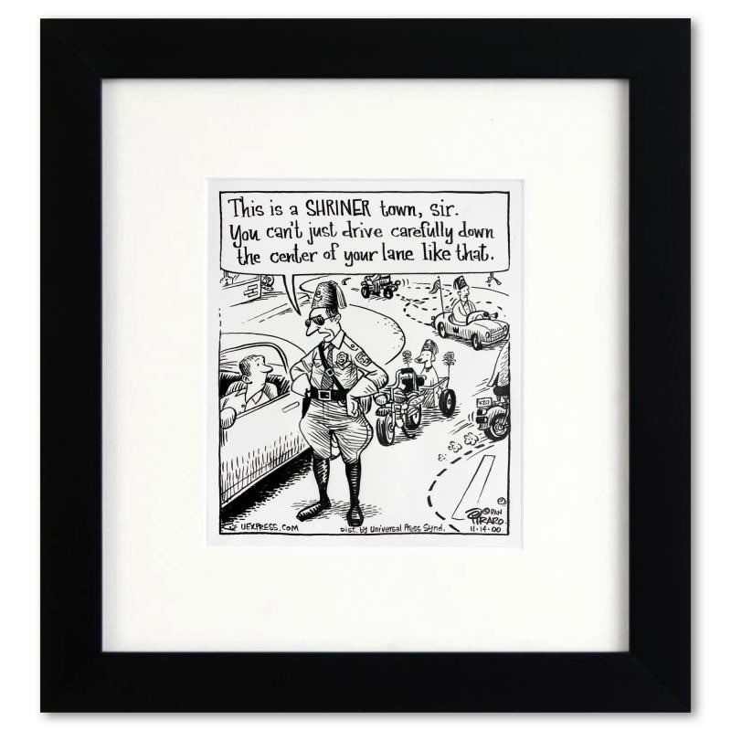 Shriner Town By Bizarro Original. Enter a surreal and satirical world of twisted imagination and award winning creativity. "Shriner Town" is an original pen & ink drawing on paper by Dan Piraro, creator of the critically acclaimed and award winning comic strip, Bizarro. This piece is hand signed, comes custom framed and includes a letter of authenticity. Measures approximately 12" x 11" (frame), 7" x 6" (image).This item requires special handling and may have a longer than usual turnaround.