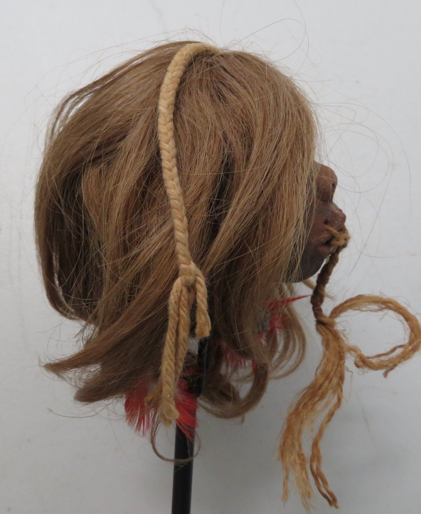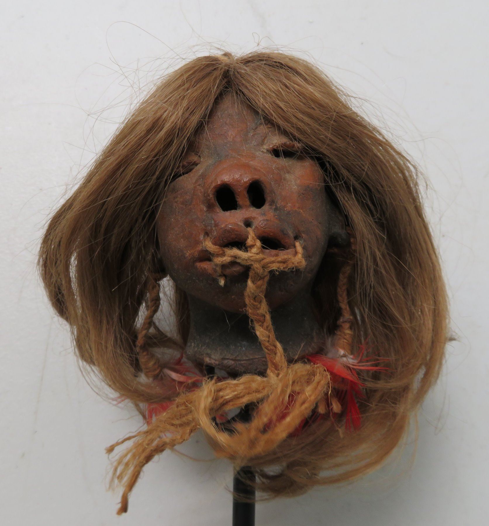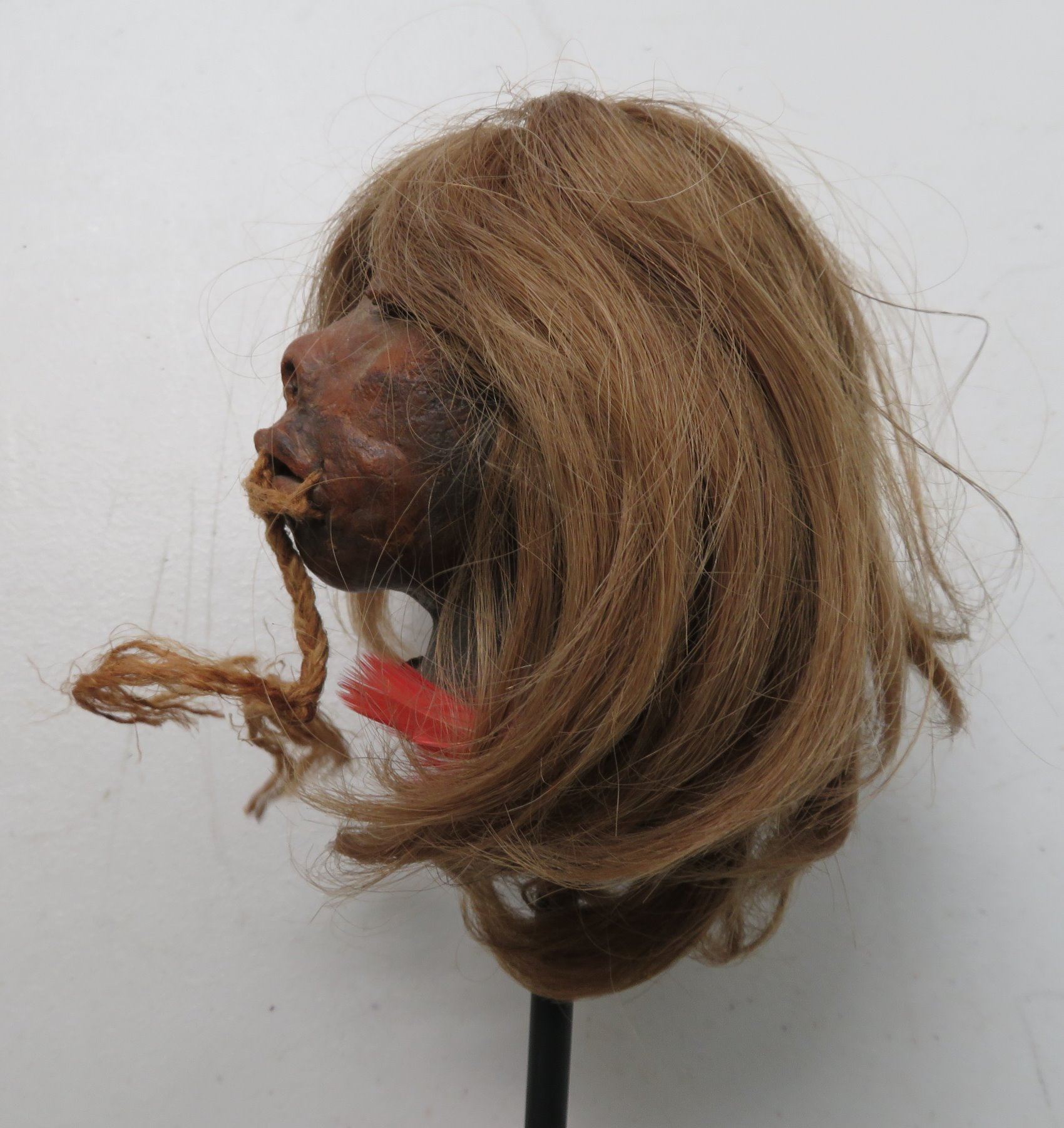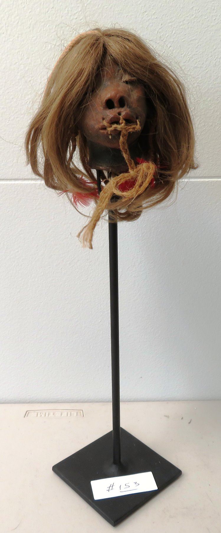 Shrunken Head Reproduction w/Stand, modern item. Made of string, plastic and hair with metal stand, the item measures 18" on stand. USA, copy of Amazonian heads. No human parts, nice steel stand. Condition: Good, displays well, see images. Shipping: $37.50 w/insurnace and signature, due to length and weight.