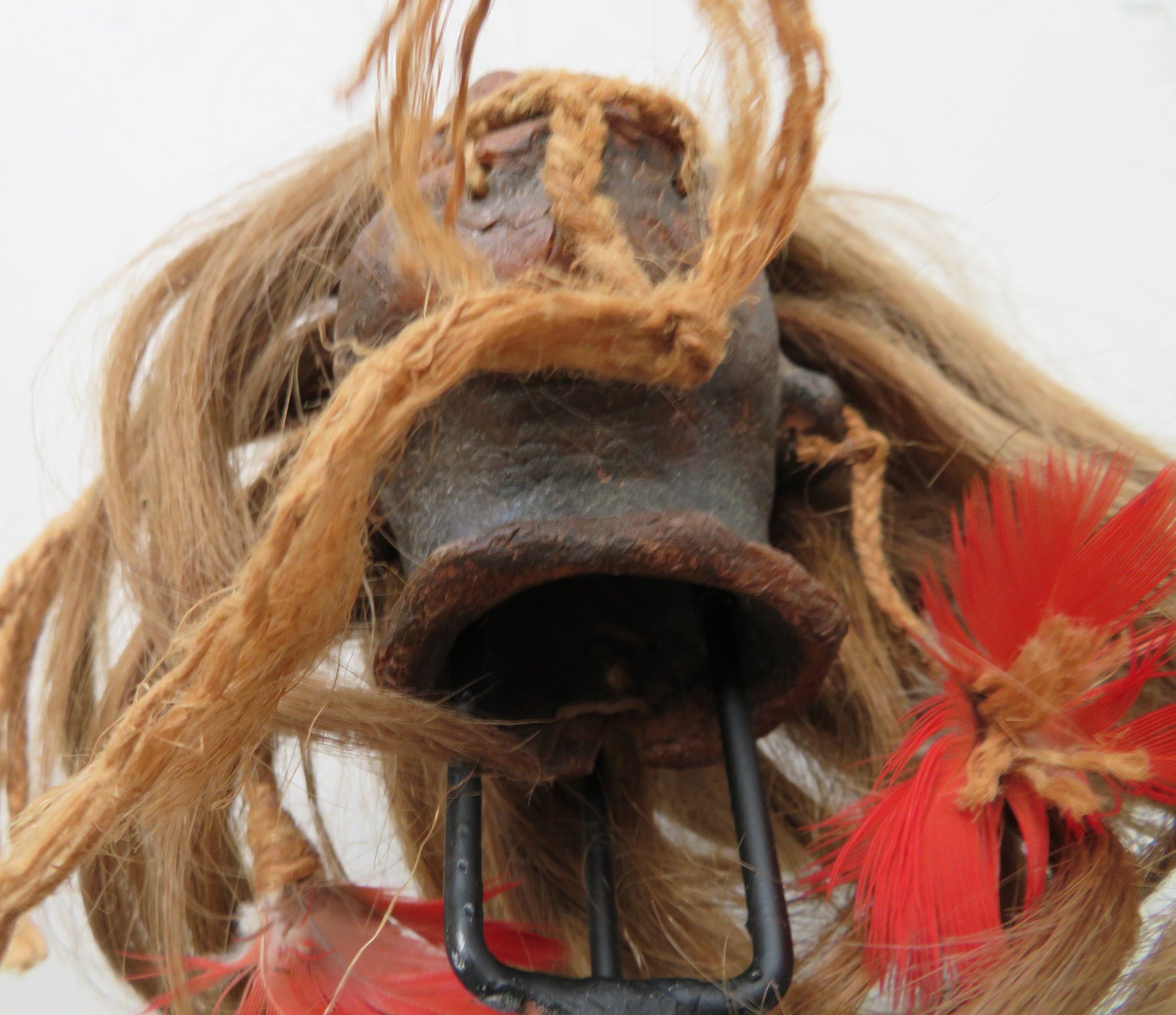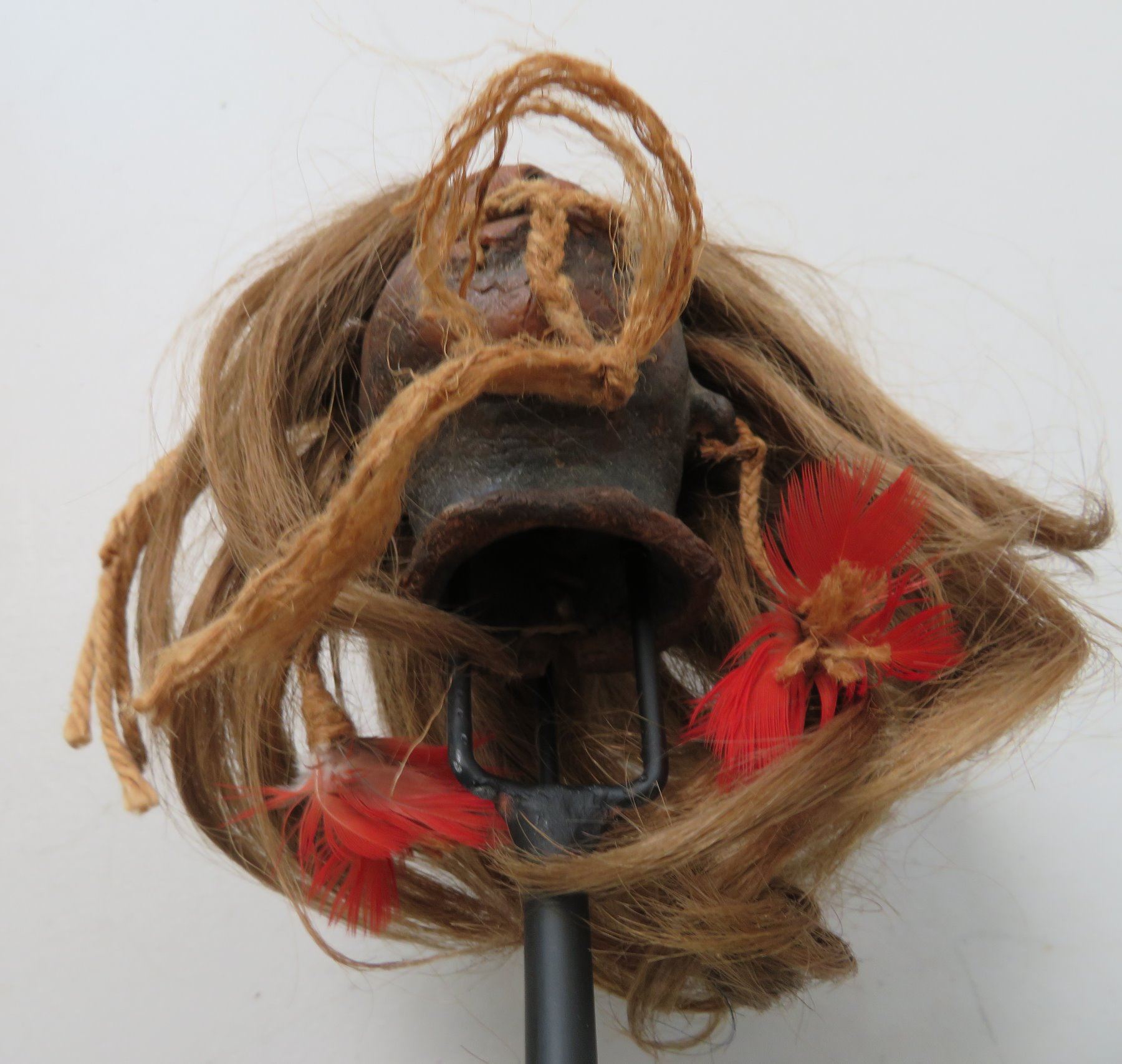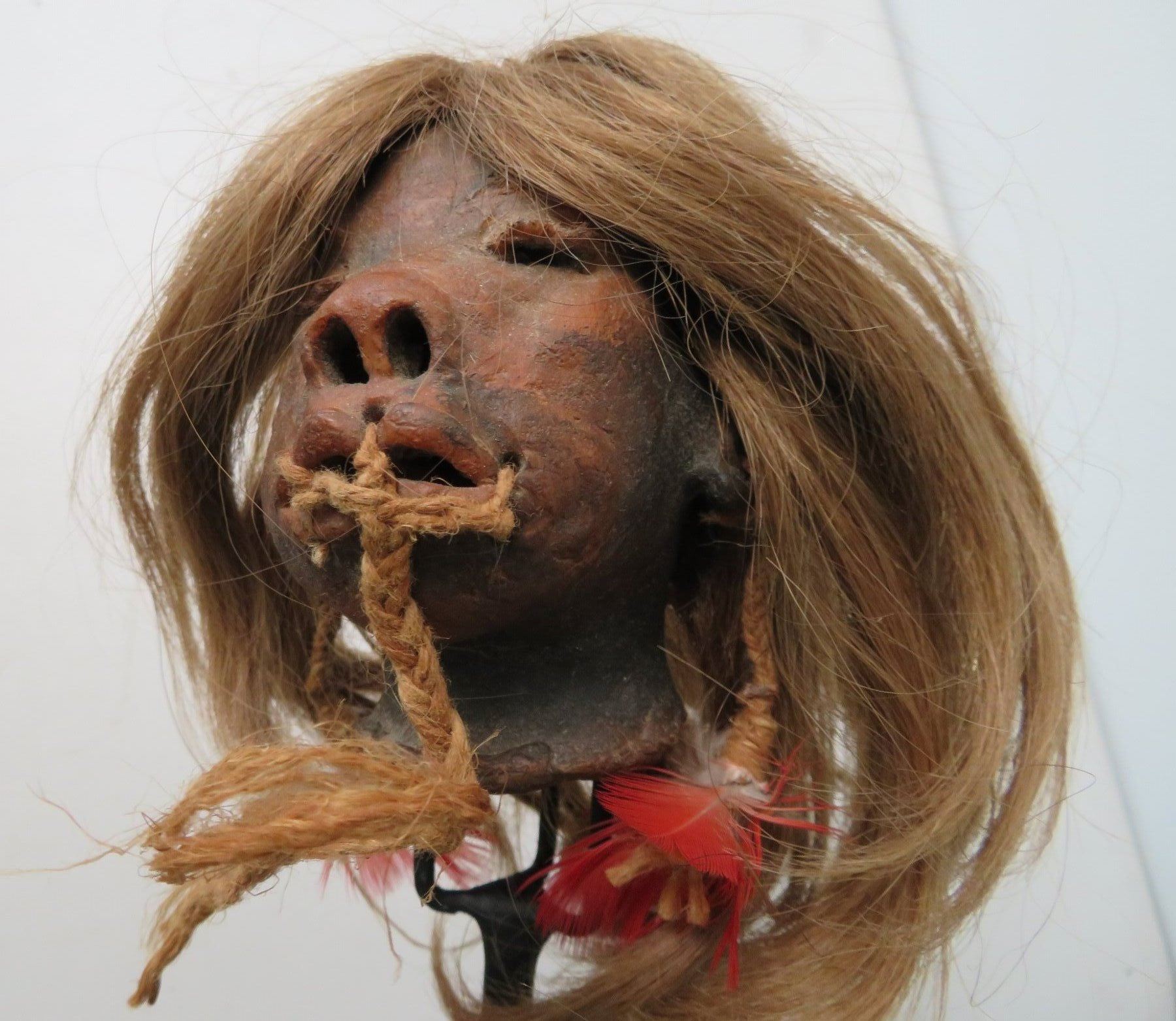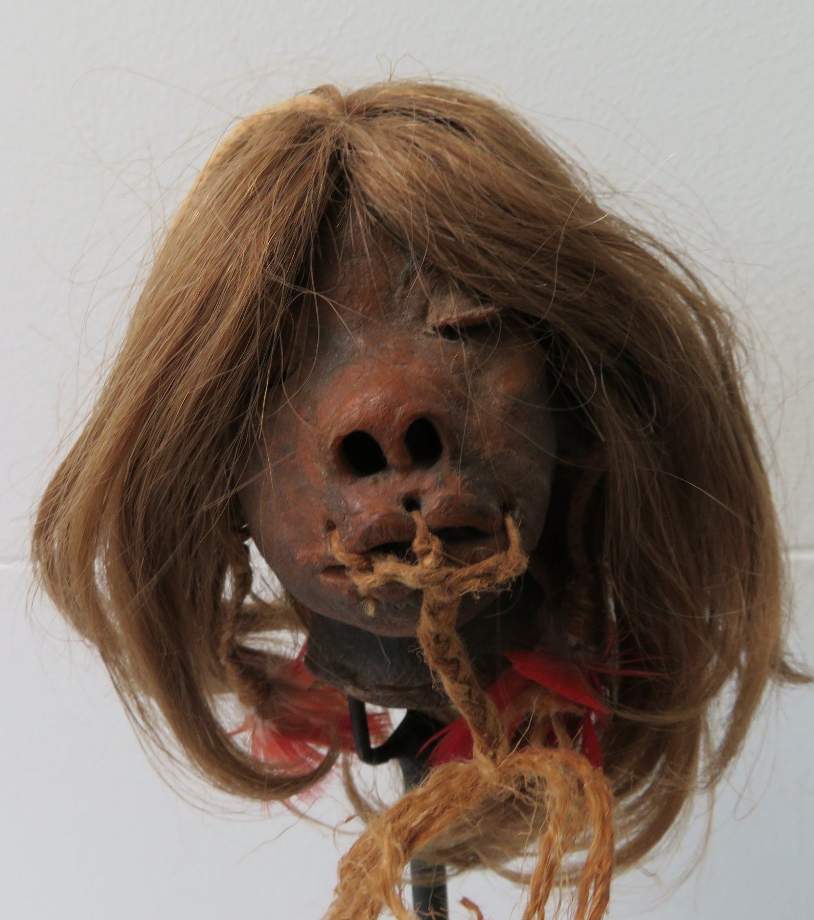 Shrunken Head Reproduction w/Stand, modern item. Made of string, plastic and hair with metal stand, the item measures 18" on stand. USA, copy of Amazonian heads. No human parts, nice steel stand. Condition: Good, displays well, see images. Shipping: $37.50 w/insurnace and signature, due to length and weight.
