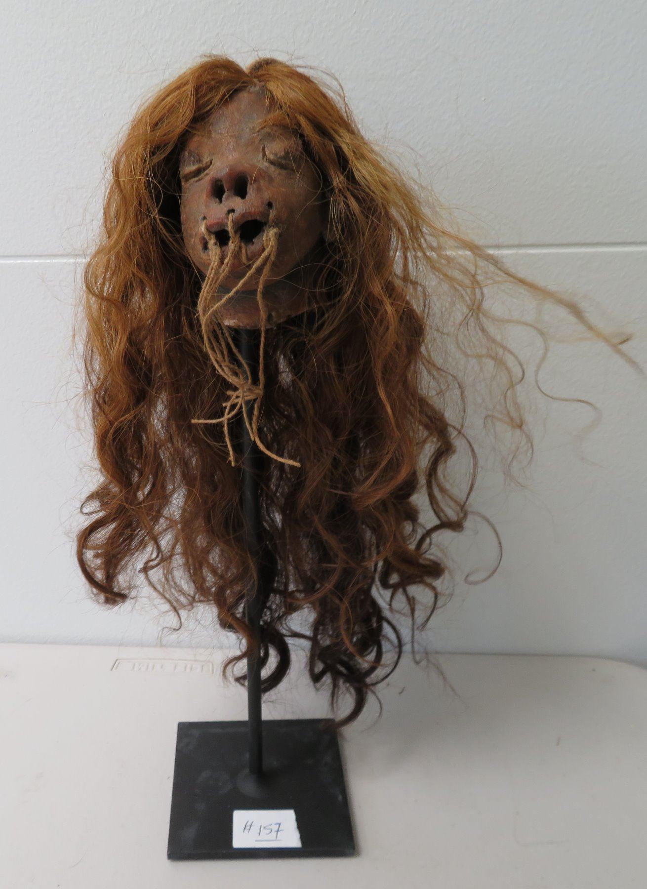 Shrunken Head Reproduction w/Stand, modern item. Made of string, plastic and hair with metal stand, the item measures 16" on stand. USA, copy of Amazonian heads. No human parts, nice steel stand. Condition: Good, displays well, see images. Shipping: $37.50 w/insurnace and signature, due to length and weight.