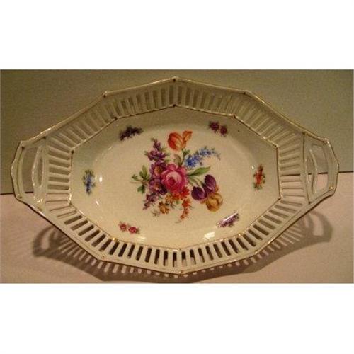 This fantastic and very lovely Floral Decorated Reticulated Two Handled Bowl is in SUPERIOR condition with no chips, cracks, dings or hairlines and it measures 11" from handle to handle and is 7" wide and stands 2" tall. It is decorated with a fantastic floral pattern including a lovely blooming iris and was manufactured by Shumann and is marked on the back with the familiar Shumann Logo.
