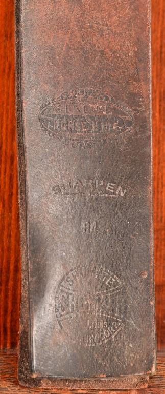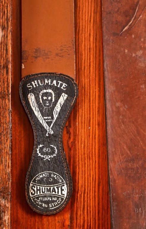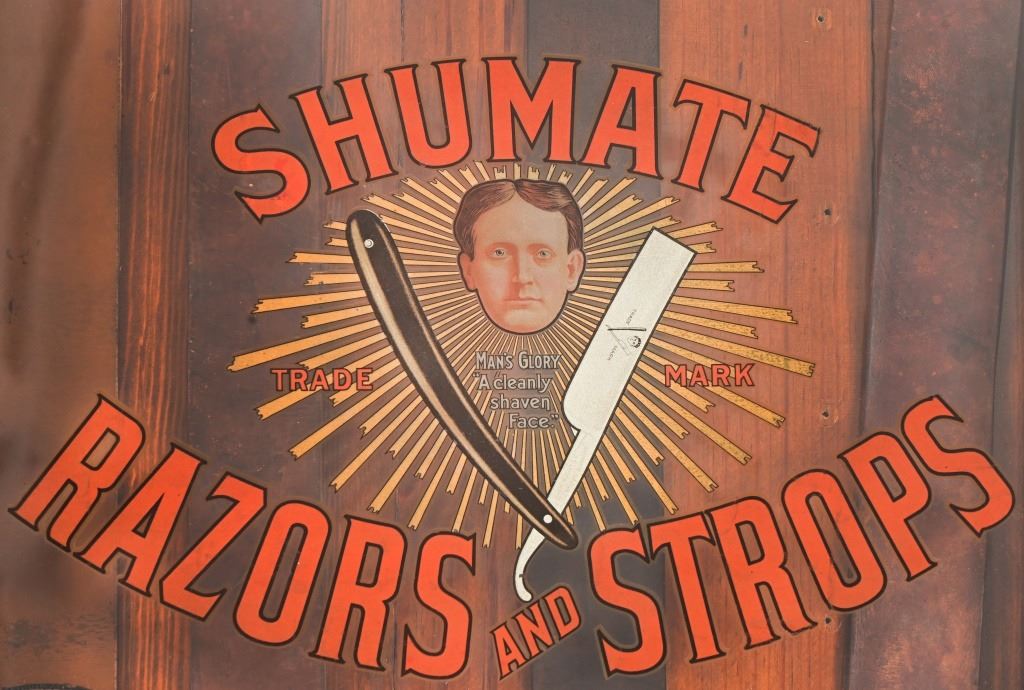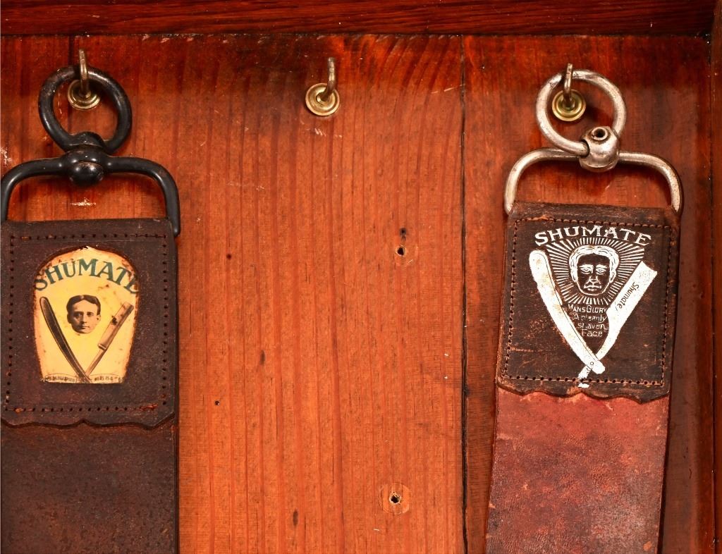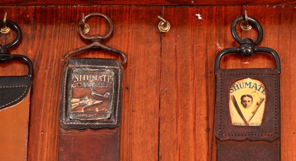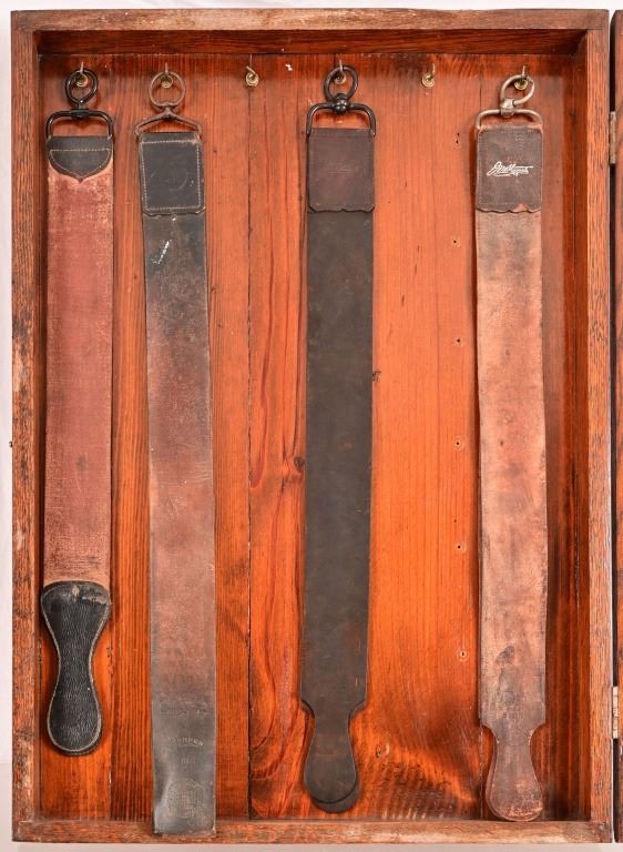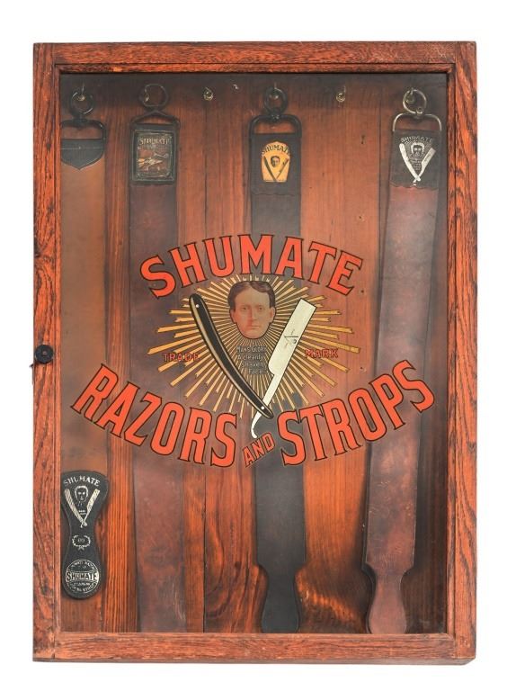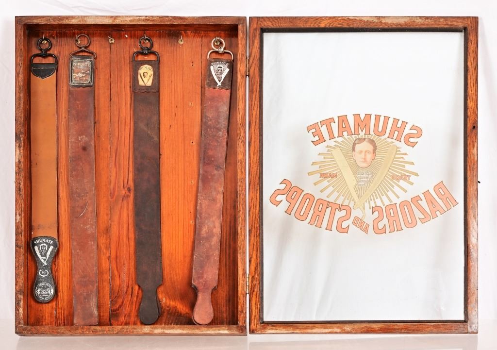 Countertop display case with 4 Shumate brand strops. Case measures 20" x 28" x 2 1/2". LOCAL PICK UP/TRANSPORT RECOMMENDED.