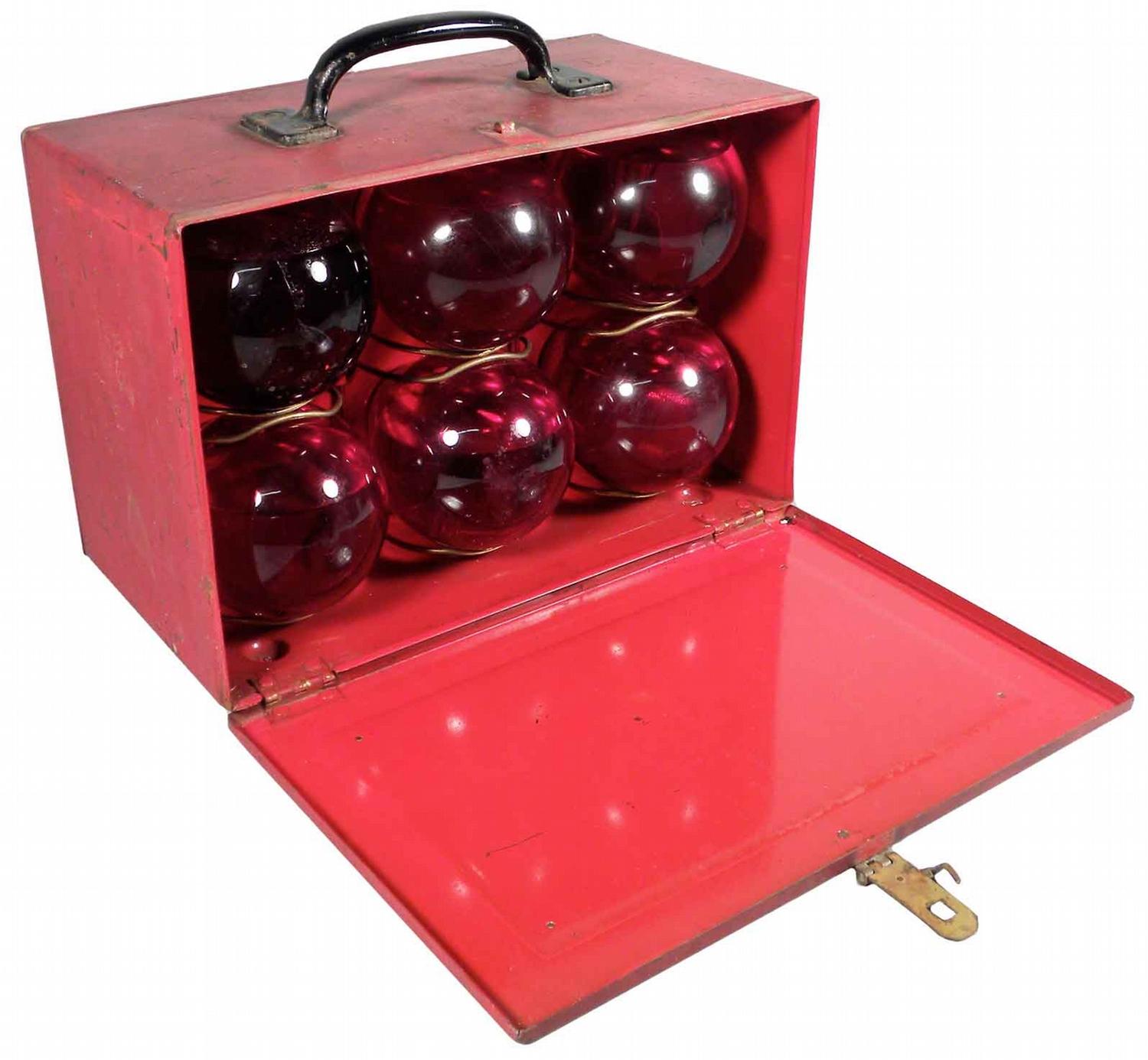 Shur-Stop Kit, Fire Extinguishers. 6 extinguisher balls in metal box. Mfg by International Fire Equipment Co. West New Brighton-Staten Island, NY. 12 1/4 X 8 1/2 X 6 1/2 inches.