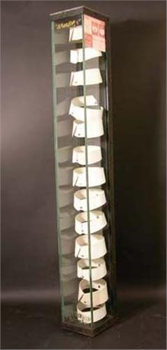 ShurEdge Collar Displaycase filled with collars and pins, original decals and paper advertising/cast iron frame with greek "key" design. 50" x 6" x 7.5".