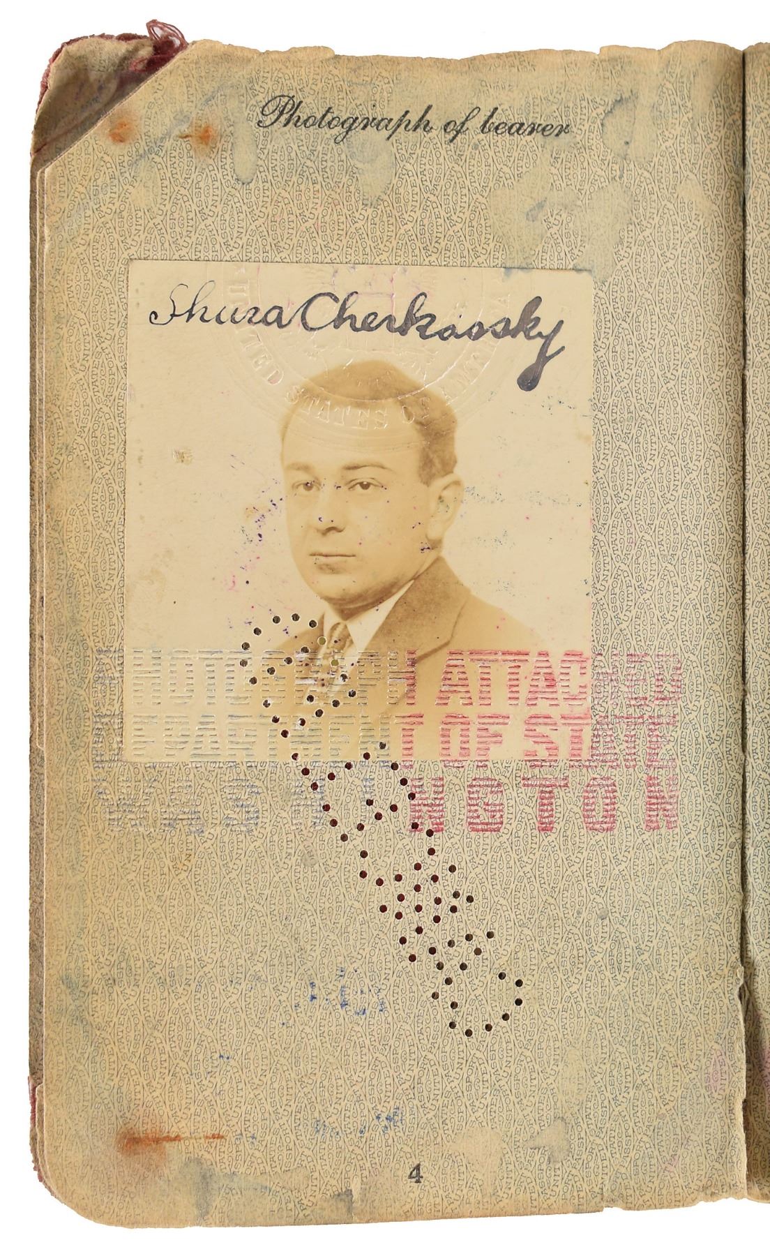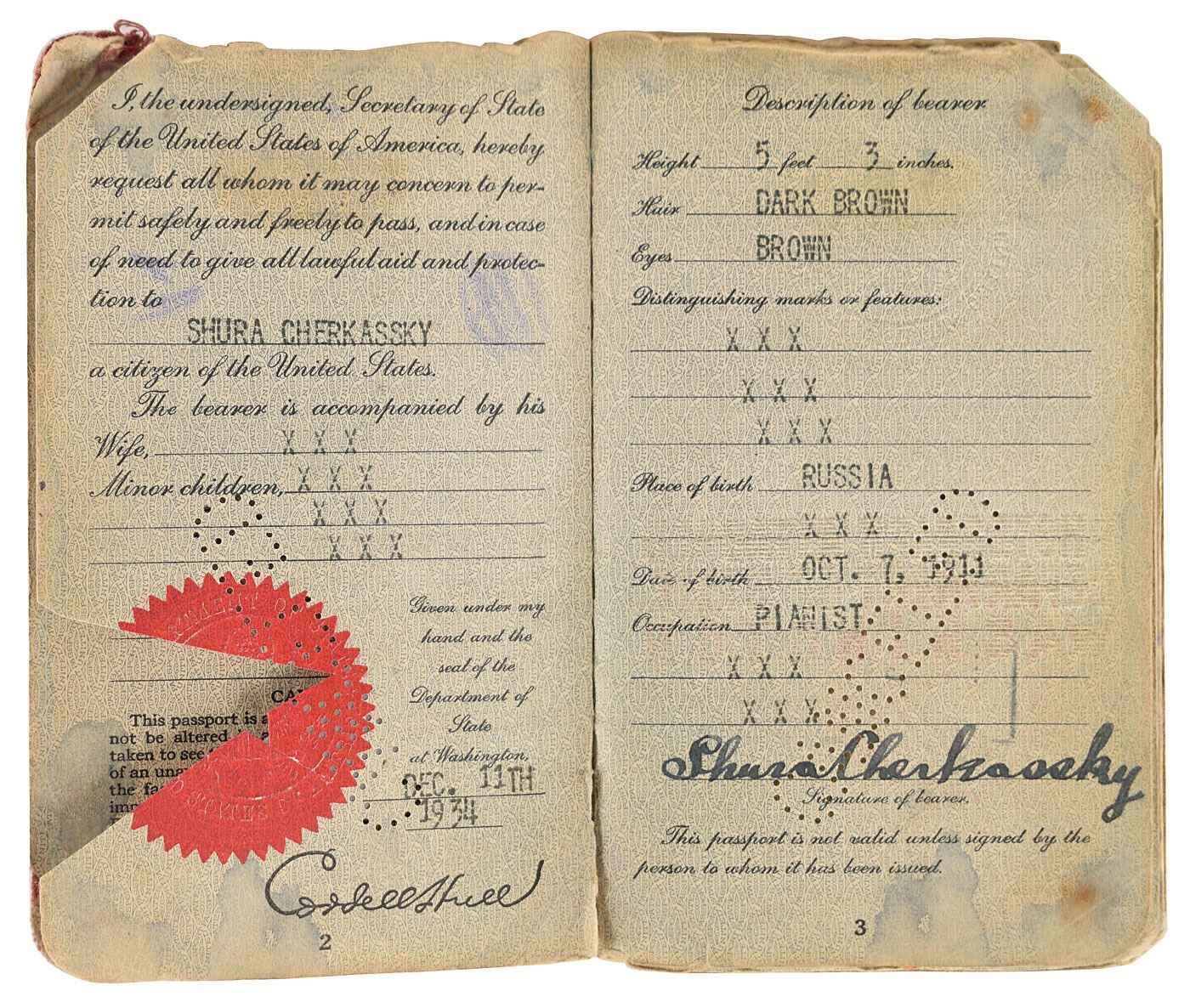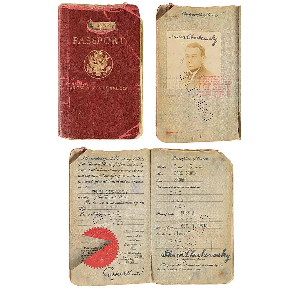 Durable and highly regarded Russian-born pianist (1911–1995) who mastered a wide-ranging repertoire of Romantic and modern works. Shura Cherkassky's well-traveled personal passport, number 157965, issued on December 11, 1934. The passport measures 3.75 x 6 and is filled out inside the cover in his own hand, "Shura Cherkassky, 305 West 98th Street, New York City," with famous pianomaker "Steinway & Sons, London," named as who to notify "in case of death or accident." His personal information is filled out in type inside, listing his occupation as "Pianist," signed below in thick fountain pen, "Shura Cherkassky." His passport photo is affixed to the opposite side, and is also signed across the top in fountain pen. The heavily used passport has several extra pages affixed inside, and includes visa stamps from all around the world: Sweden, France, Nazi Germany, England, Russia, Finland, Poland, Japan, and China, among many others. In very good condition, with moderately heavy overall wear from frequent use.
