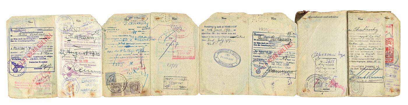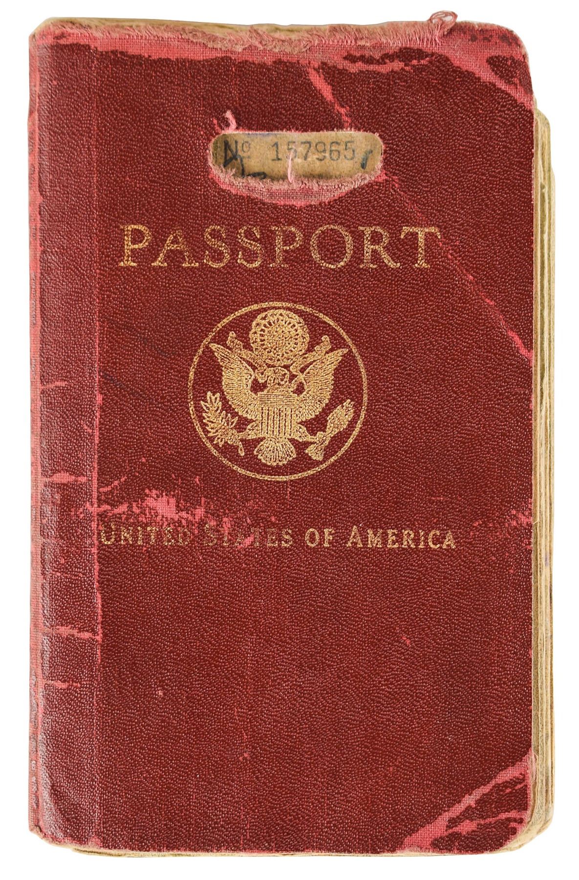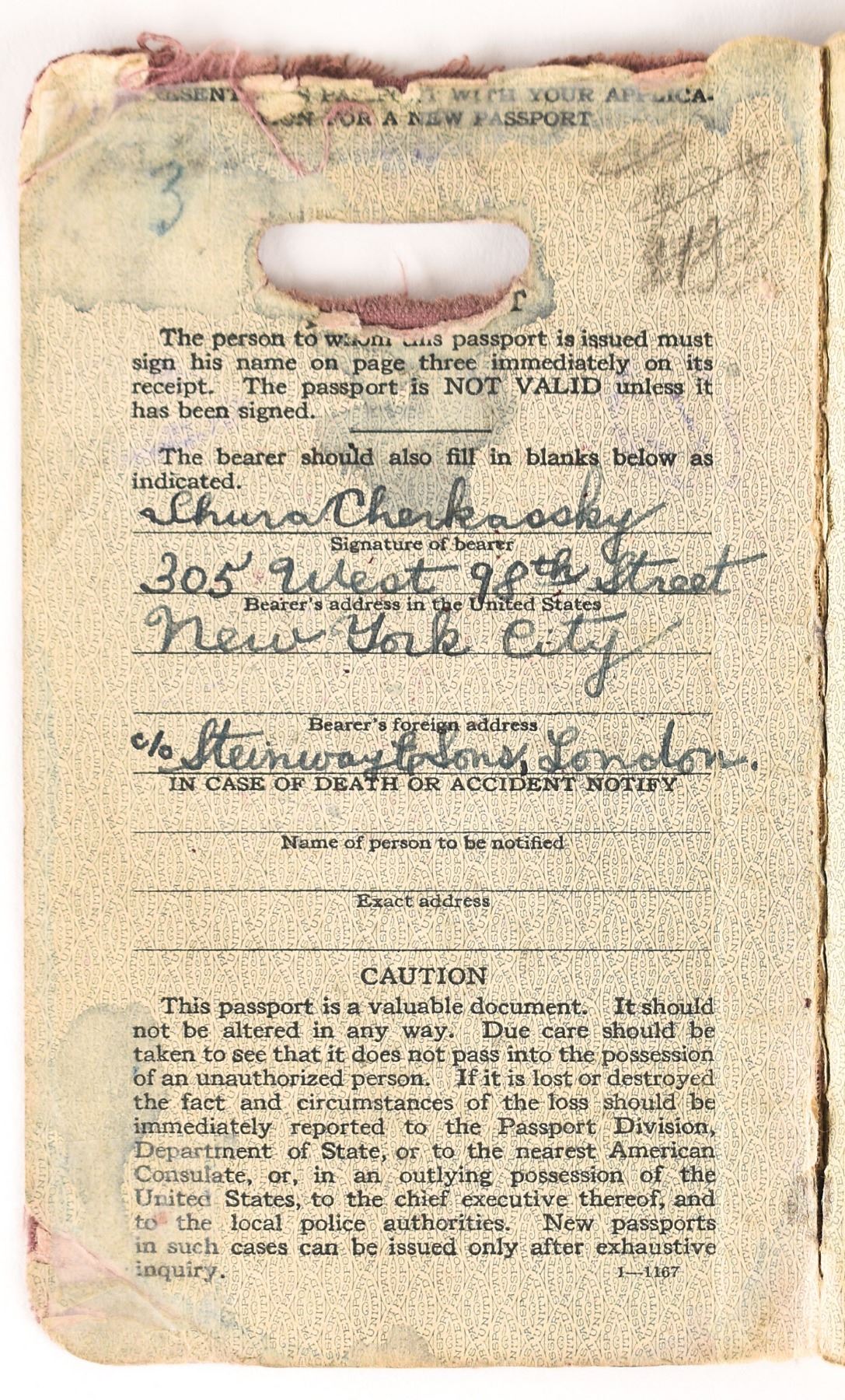 Durable and highly regarded Russian-born pianist (1911–1995) who mastered a wide-ranging repertoire of Romantic and modern works. Shura Cherkassky's well-traveled personal passport, number 157965, issued on December 11, 1934. The passport measures 3.75 x 6 and is filled out inside the cover in his own hand, "Shura Cherkassky, 305 West 98th Street, New York City," with famous pianomaker "Steinway & Sons, London," named as who to notify "in case of death or accident." His personal information is filled out in type inside, listing his occupation as "Pianist," signed below in thick fountain pen, "Shura Cherkassky." His passport photo is affixed to the opposite side, and is also signed across the top in fountain pen. The heavily used passport has several extra pages affixed inside, and includes visa stamps from all around the world: Sweden, France, Nazi Germany, England, Russia, Finland, Poland, Japan, and China, among many others. In very good condition, with moderately heavy overall wear from frequent use.