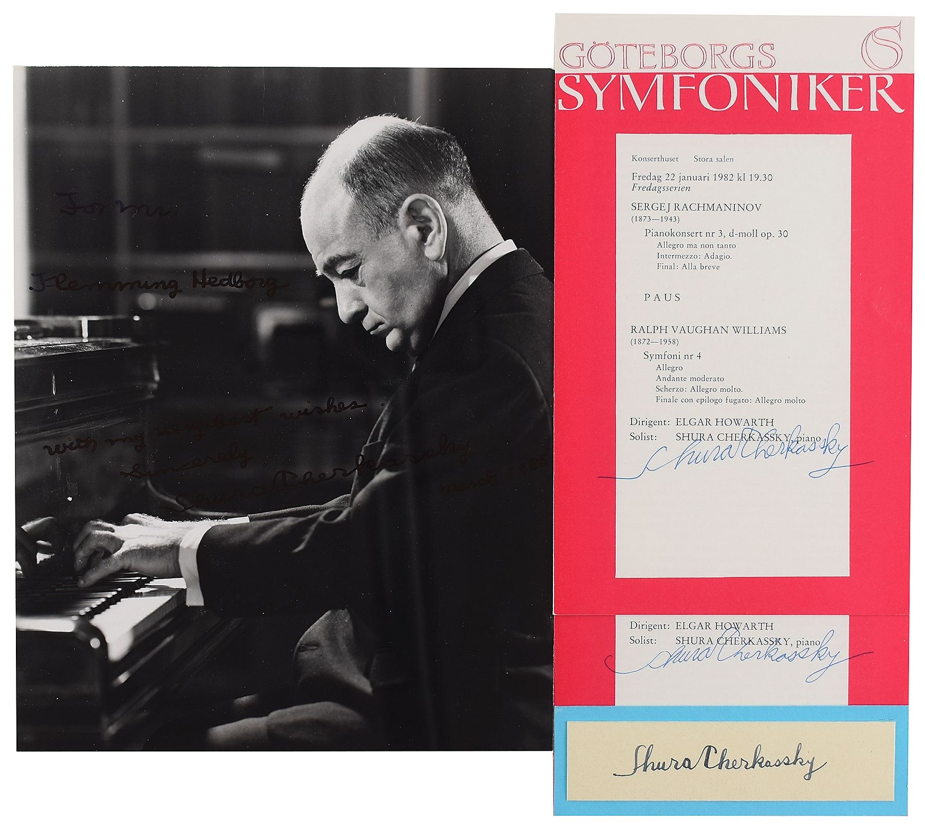 Four items: a semi-glossy 7.5 x 9.5 of Cherkassky at the piano, signed and inscribed in fountain pen, "For Mr. Flemming Hedborg, with my very best wishes, Sincerely, Shura Cherkassky, March 1985"; a vintage fountain pen signature, "Shura Cherkassky," on an off-white 4.5 x 1 slip mounted to a slightly larger card; and two programs for a 1982 concert, each signed in blue ballpoint by Cherkassky. In fine condition, with moderate contrast to the handwriting on the signed photo.