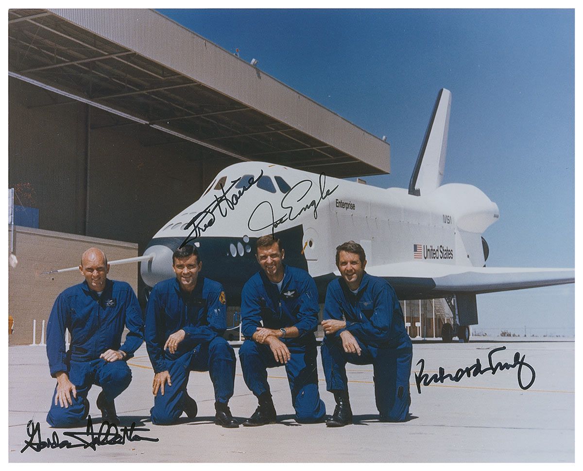 Color glossy 10 x 8 photo of both crews of the Space Shuttle Approach and Landing Tests (ALT) at the Rockwell International Space Division's Orbiter assembly facility at Palmdale, California on the day of the rollout of the Shuttle Orbiter 101 ‘Enterprise’ spacecraft, signed in black felt tip by Gordon Fullerton (pilot of the first crew), Fred W. Haise (commander of the first crew), Joe Engle (commander of the second crew), and Richard Truly (pilot of the second crew). In fine condition.