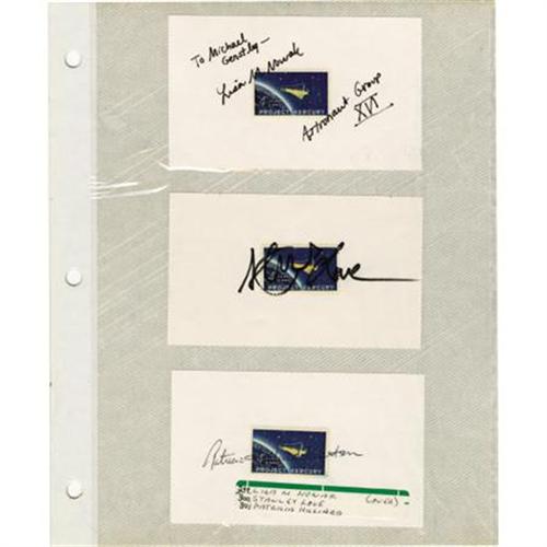<B>Shuttle Astronauts Autographed Stamps.</B></I> Comprises seven 5” x 3” index cards, each bearing the 4¢ Project Mercury stamp, each signed by a space shuttle astronaut: “<I>to Michael/ Gerstley-/ Lisa M. Nowak/ Astronaut Group/ XVI,” “Bill Oefelein/ NASA/ Astronaut,” “Clayton C. Anderson/ Group 17,” “To Michael Gerstley - Best Wishes!/ Leroy Chiao STS- 65, 72, 92/ 10-6-99,” “Stanley Love,” “Patricia Hilliard Robertson,</B></I>” and “<I>James Kelly/STS-102.</B></I>” Signatures on the stamps have adequate contrast.<B>Lisa Nowak</B></I> returned to Navy duty in March 2007 and <B>Bill Oefelein</B></I> returned to Navy duty in May, nearly four months after authorities believe his cooled relationship with Nowak led her to drive 900 miles from Houston to Orlando, Florida, and confront her romantic rival, an Air Force captain. Nowak is a Navy captain; Oefelein is a Navy commander. The cards have been affixed to self-adhesive album pages. Seven items. <BR><BR><b>Shipping:</b> Flat Material, Small (<a target="_blank" href="http://www.heritageauctions.com/common/shipping.php">view shipping information</a>)