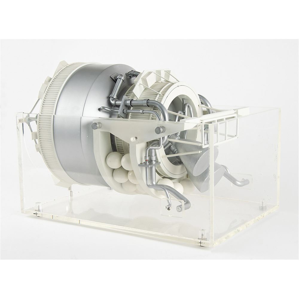 Interesting scale model of the Centaur upper stage rocket designed to be carried aloft inside the Space Shuttle, measuring 12è long and 8.5è in diameter, set inside an acrylic display case and housed within its original wooden shipping crate, marked "NASA Exhibit Material," with the shipping address of the Glenn Research Center in Cleveland, Ohio. The model features the large LH2/LO2 tanks, avionics boxes, hydrazine and helium bottles, and dual main engines. In very good condition, with the two engine thrusters broken off from their mounting pegs, but retained by the attached tubing.