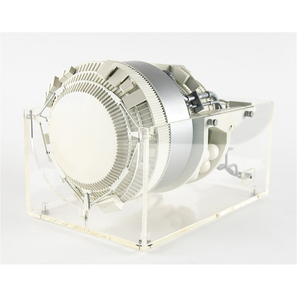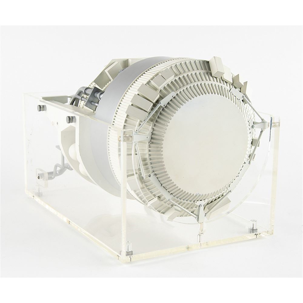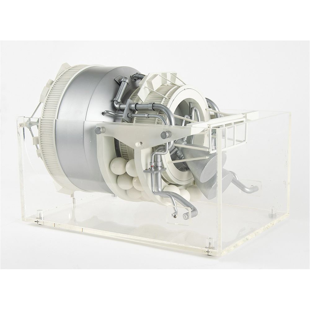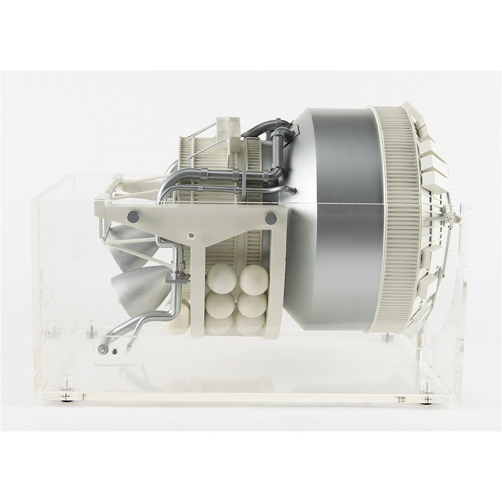 Interesting scale model of the Centaur upper stage rocket designed to be carried aloft inside the Space Shuttle, measuring 12Ë long and 8.5Ë in diameter, set inside an acrylic display case and housed within its original wooden shipping crate, marked "NASA Exhibit Material," with the shipping address of the Glenn Research Center in Cleveland, Ohio. The model features the large LH2/LO2 tanks, avionics boxes, hydrazine and helium bottles, and dual main engines. In very good condition, with the two engine thrusters broken off from their mounting pegs, but retained by the attached tubing.