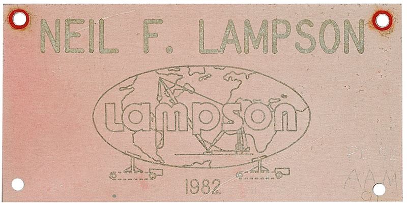 Metallic crawler engraved nameplate, 5 x 2.5, issued to “Neil F. Lampson, 1982,” and featuring the Lampson company logo. This nameplate was formerly affixed to a crawler that moved the space shuttle to the launch pad. Several numbers and letters scratched into the lower right. In fine condition, with slight discoloration.