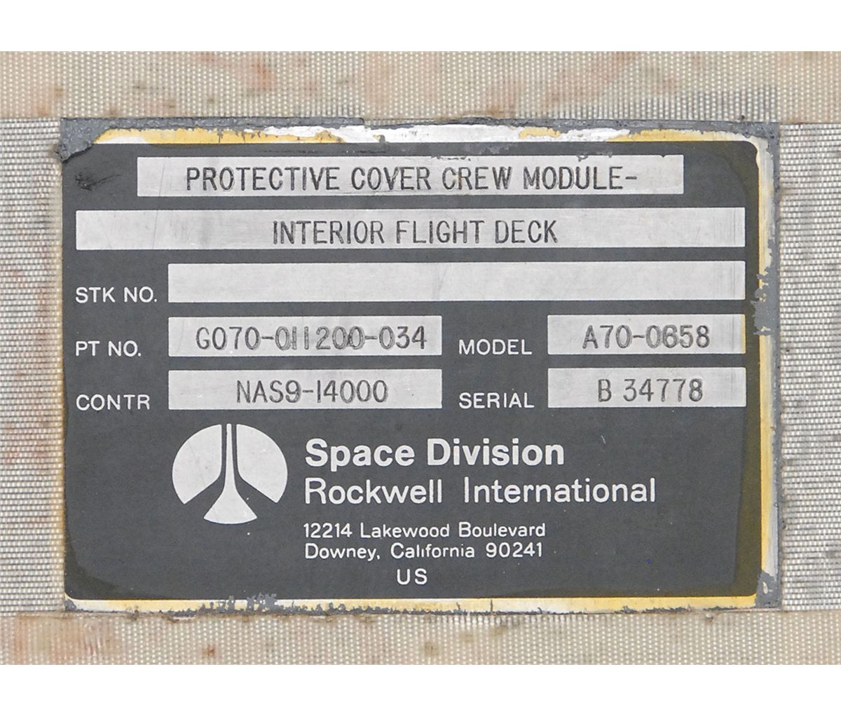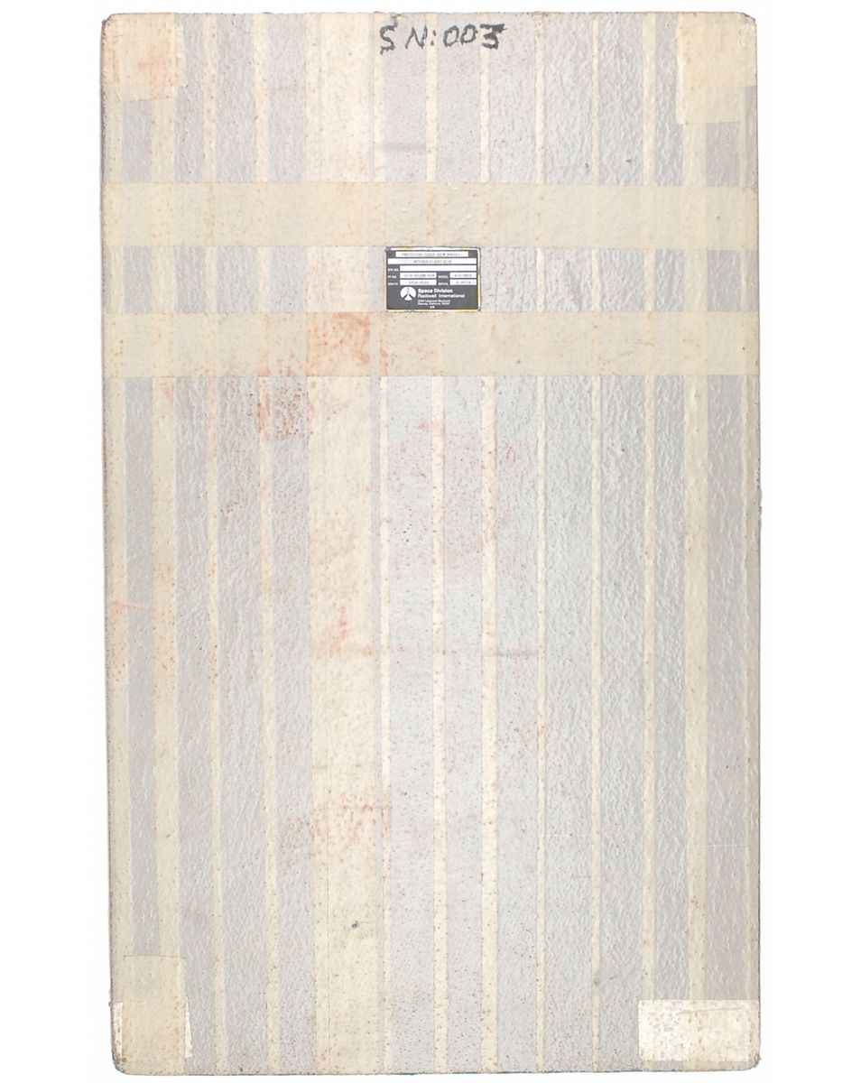 Protective Cover Crew Module-Interior Flight Deck, 20.5 x 33.5, used to protect the interior of the Shuttle from UV damage while on the ground, bearing a handwritten number, “SN:003.” Affixed Rockwell International Space Division plaque reads: "Protective Cover Crew Module-Interior Flight Deck, Pt. No. G070-011200-034, Model A70-0658, Contr. NAS9-14000, Serial B34778." Entire front of the panel is covered in white tape with some of the red stencil showing through. In fine condition.