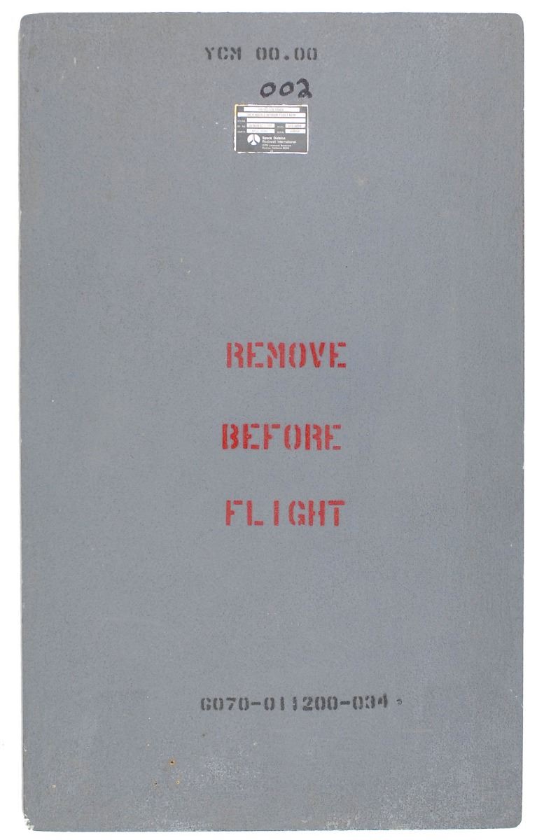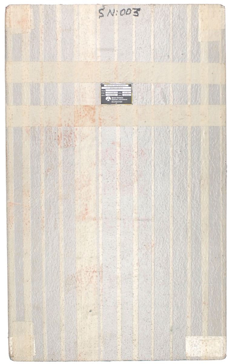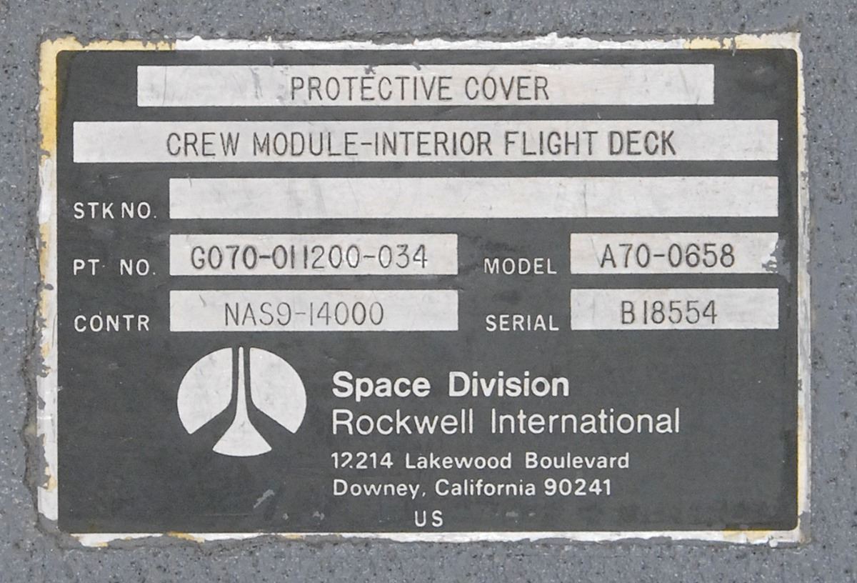 Uncommon pairing of Crew Module-Interior Flight Deck Protective Covers, 20.5 x 33.5, used to protect the interior of the Shuttle from UV damage while on the ground, each bearing a handwritten number, “002” and “SN:003.” Both bear an affixed Rockwell International Space Division label or plaque with unique serial numbers, “B18554" and “B34778.” The first is stenciled in the center in bright red letters, "REMOVE BEFORE FLIGHT," and the other panel is covered in white tape with some of the red stencil showing through. In overall fine condition. Contact RR Auction for a shipping quote.