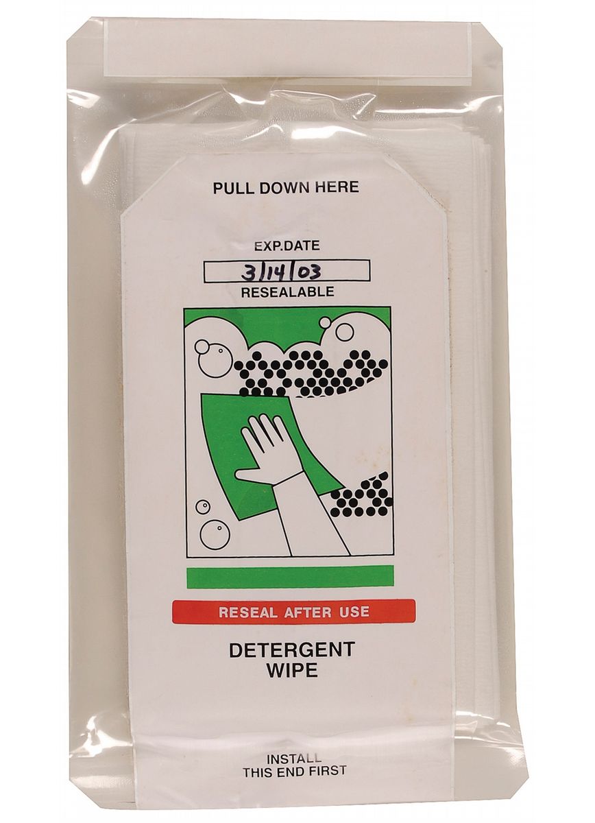 Detergent wipes, bagged for flight, with an overall size of 5.5 x 10, with a label reading “Detergent Wipe,” with a 2003 expiration date, a serial number, and two squares of Velcro affixed to the reverse; and a package of Pond’s Cleansing Towelettes, with a serial number cancelled with a red felt tip III, and a small circle of Velcro affixed to the back of the package.