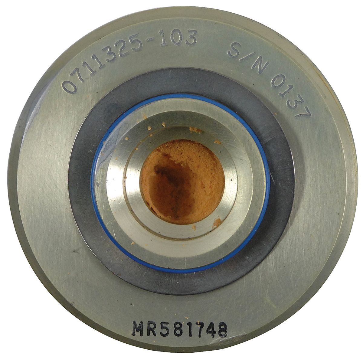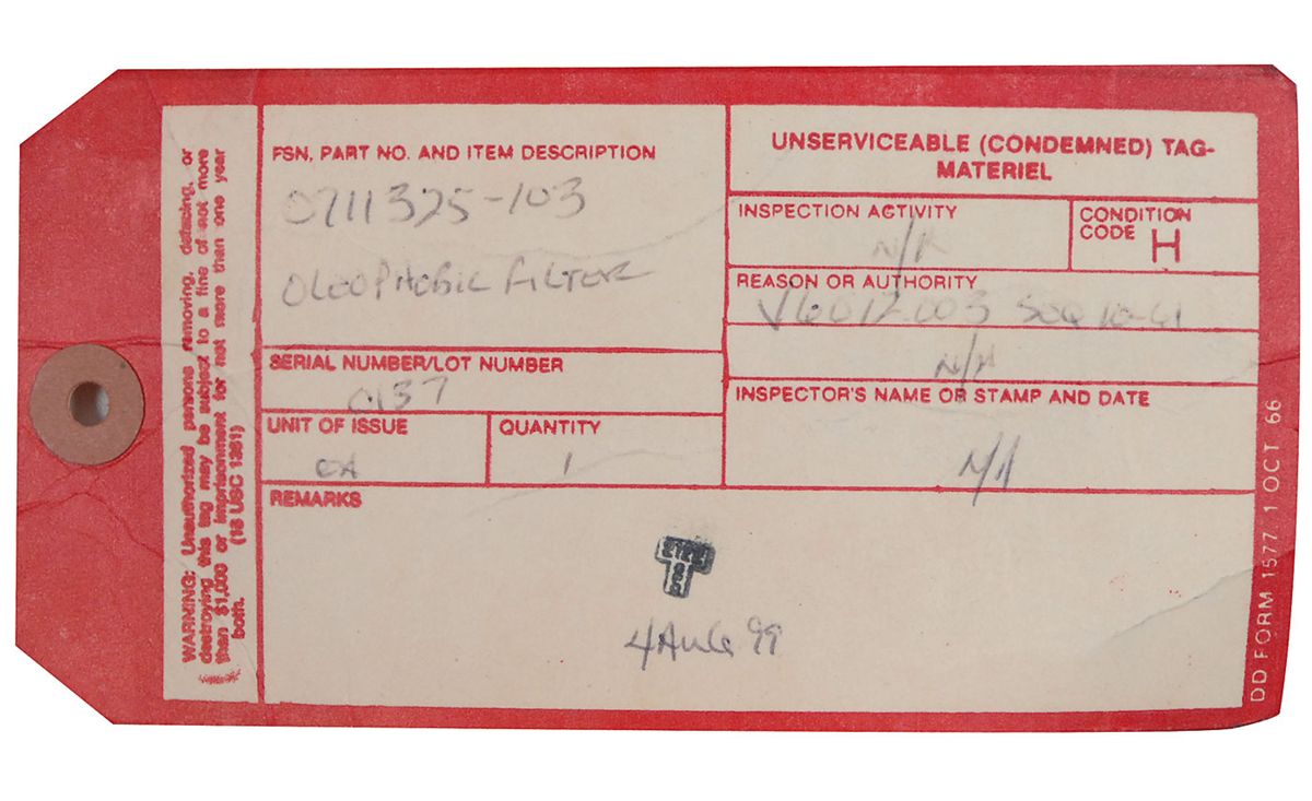 Flown oleophobic filter canister from a shuttle orbiter body flap, 5? tall and 3? in diameter, bearing engraved part numbers on top, “0711325-103 S/N 0137 MR581748.” Includes the original decommissioning tag, dated August 4, 1999. A dent to one side of the canister, otherwise fine condition. Flown status presumed by shuttle memorabilia specialist Ken Havekotte.