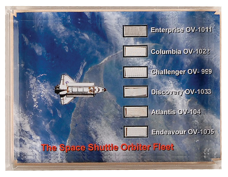Small swatches on insulation from all six Space Shuttles, all incorporated into a color photo of a shuttle in orbit and encased in Lucite to an overall size of 3.75 x 2.75.