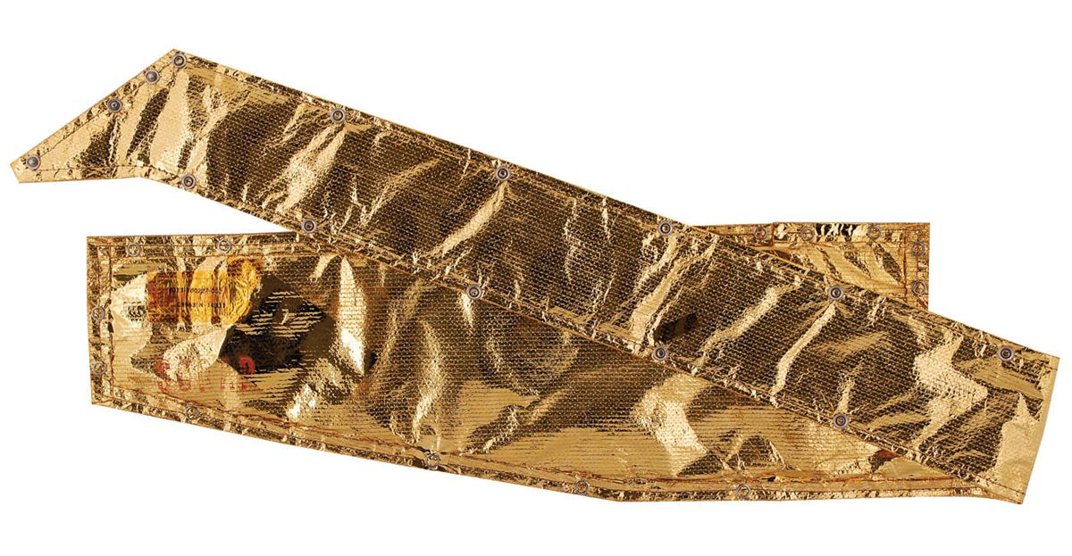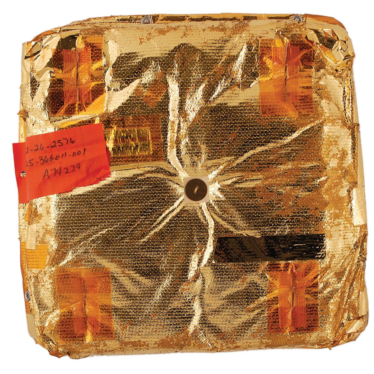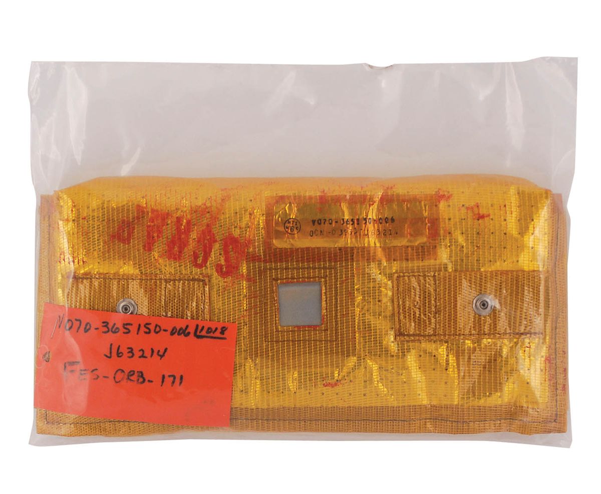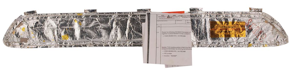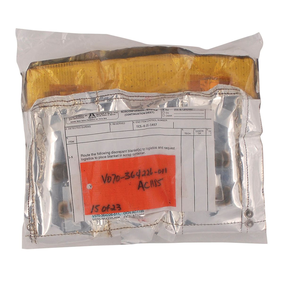 Available to US bidders only. A nice collection of six flown Orbiter TCS (Thermal Control System) blankets, various sizes, and configurations ranging in size from 9 x 4 up to 55.5 x 8, all of which have been labeled in red ink or stamped “Scrap.” Most of the blankets have come from the aft compartment by the space shuttle main engines areas. In fine condition, with expected wear. Available to US bidders only.