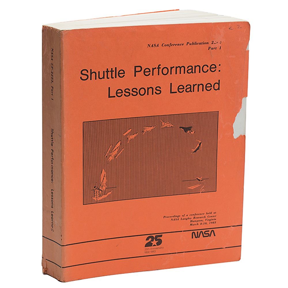 Scarce official NASA publication: Shuttle Performance: Lessons Learned, Parts 1 and 2 (NASA CP-2283). Washington, DC: 1983. Softcover, 8.5 x 11, totaling 1401 pages. The books contain the proceedings of a conference held at NASA Langley Research Center in Hampton, Virginia, from March 8–10, 1983, which covered what was learned during Space Shuttle missions STS-1 through STS-5. In very good to fine condition, with tears and chipping to the wrappers of the first volume.