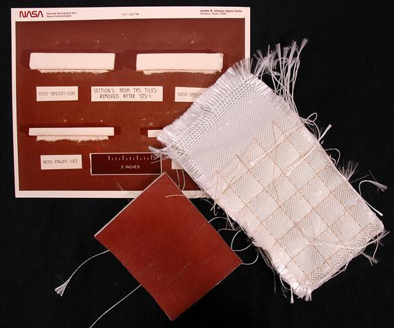 Shuttle Program, Shuttle "Tiles". Lot of six different sizes, shapes and colors, each with different numbers stencilled on the tiles. These were probably not flown, but will still make a great addition to any collection. Note: Shuttle tiles can only be sold to American citizens and not shipped overseas. ALSO five irregular pieces of Shuttle protective pads and NASA color photos of tiles removed after the flight of STS-1. A nice lot.