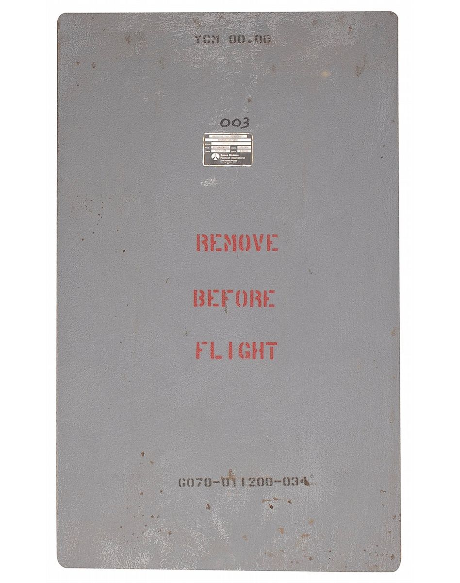Large “Remove Before Flight” protective cover, 20.5 x 33.5, stenciled in red paint “Remove Before Flight.” Panel also bears a Rockwell International Space Division label which reads, “Protective Cover Crew Module, Interior Flight Deck, Model: A70-0658.” In fine condition. This cover was used to protect the interior of the Shuttle from UV damage while on the ground.