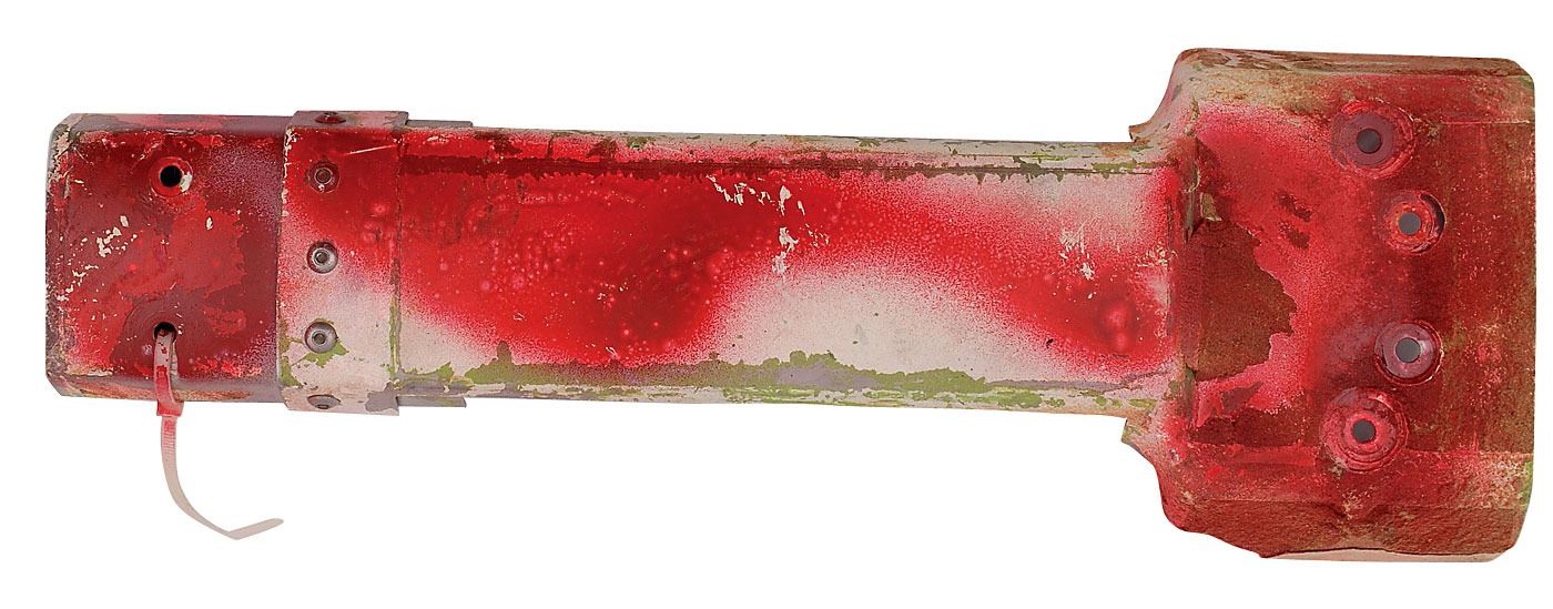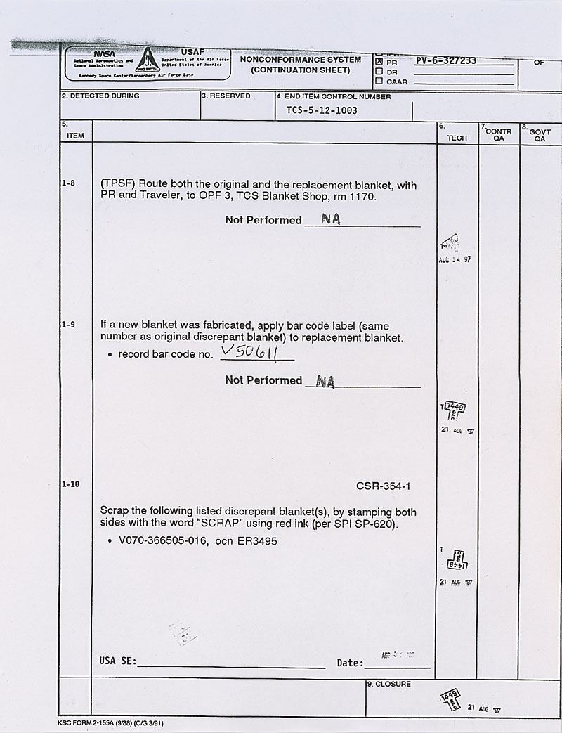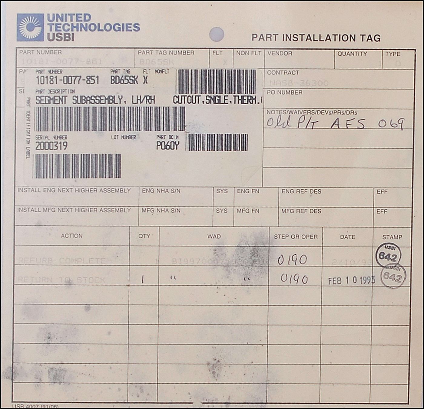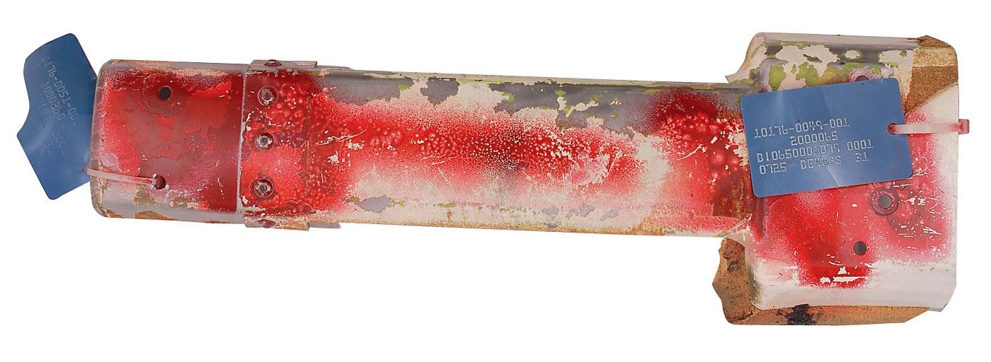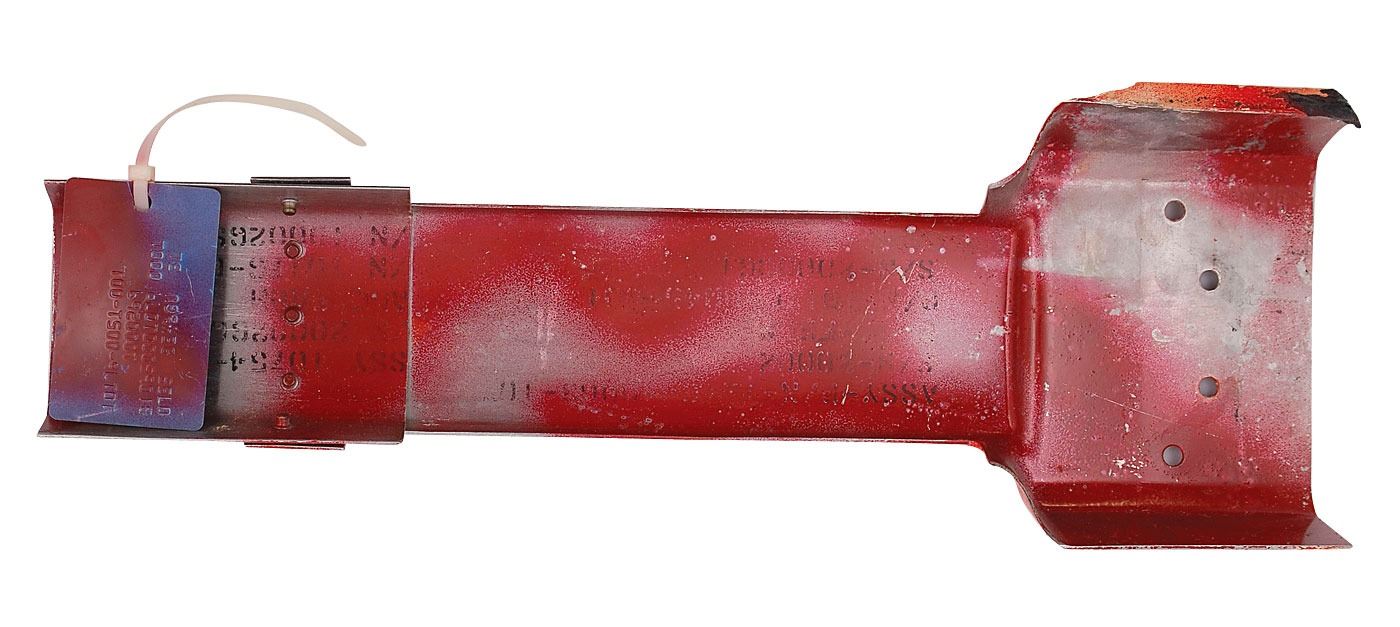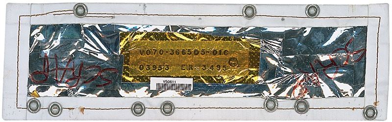 Available to US bidders only. Two items: a Shuttle TCS payload bay blanket, most likely flown, #V070-366505-016, measures 11 x 3.5, and is labeled “Scrap” on both sides in a technician’s hand; and four sections of flown System Tunnel, each measuring approximately 18.5? long with various serial numbers printed on inside. Each tunnel portion retains original paint and NASA tags, with one tag cracked. Includes a United Technologies Part Installation Tag, describing the part as “Segment Subassembly, LH/RH, Cutout, Sngle, Therm.” In overall very good to fine condition, with expected wear from use. Blanket is accompanied by a copy of a NASA Nonconformance System report noting the scraping of the part as well as a red tag. The SRB systems tunnel, located at the 90° position of each SRB, houses the electrical cables associated with the E&I subsystem and the LSC of the Range Safety System (RSS). The tunnel provides lightning, thermal, and aerodynamic protection and mechanical support for the cables and the LSC.