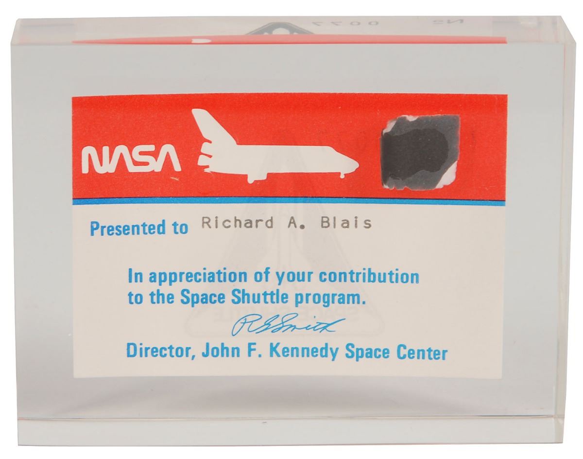 Interesting collection of early Space Shuttle tile fragments, including: a 3.5? long segment given by Lockheed to STS-1 VIP launch guests and select members of the news media, in its original case with descriptive card; a flown fragment of tile from the Space Shuttle Columbia removed after the STS-1 mission, encased in acrylic and given to a Kennedy Space Center employee in recognition of their contribution; and a loose 2? long unflown section of Shuttle tile. In overall very good to fine condition. From the collection of aerospace memorabilia specialist Ken Havekotte.