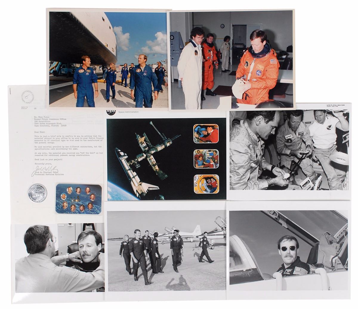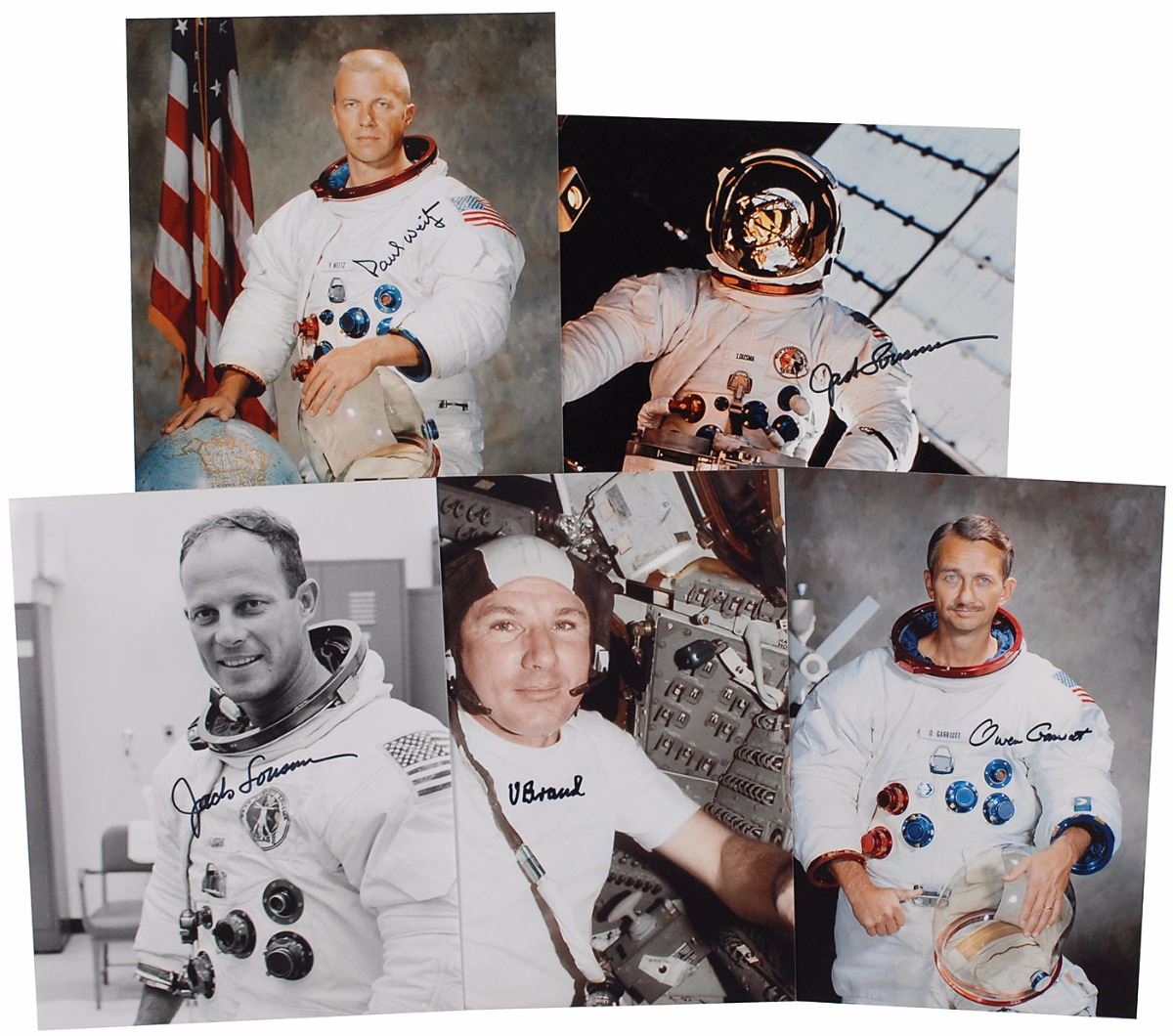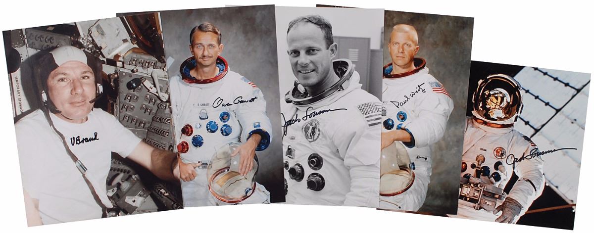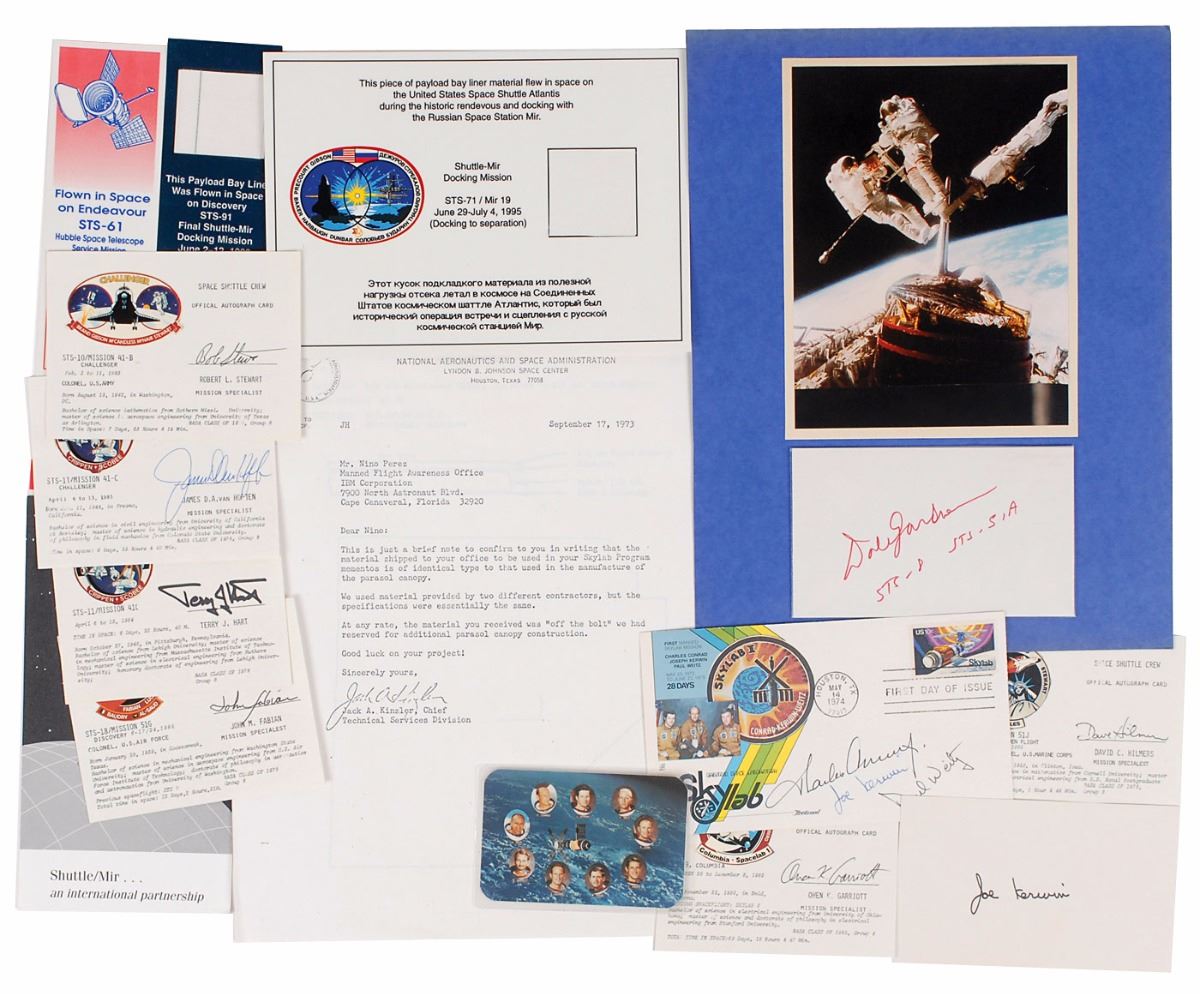 Large collection of over thirty items related to the Skylab and Space Shuttle programs, including: a flown Space Shuttle Thermal Protection System (TPS) tile segment flown on the first four flights of Space Shuttle Discovery, encased in a limited edition acrylic display numbered 4/200; a color semi-glossy 5.75 x 9 photo of the crew of STS–41–B, affixed to its original 8 x 10.75 mount, signed vertically on the mount in black felt tip, “V. Brand,” “Bob Stewart,” “Bruce McCandless II,” “Hoot Gibson,” and “Ron McNair”; five satin-finish photos of astronauts from the Apollo–Soyuz and Skylab missions, 8 x 10 and 10 x 8, each signed in black felt tip by the astronaut pictured, including Vance Brand, Owen Garriott, Paul Weitz, and Jack Lousma (2); an FDC signed in ink by Charles Conrad, Joe Kerwin, and Paul Weitz; an off-white card signed by Dale Gardner; six custom-made cards signed in ballpoint and felt tip by Space Shuttle crew members James D. A. van Hoften, Bob Stewart, Terry J. Hart, Owen K. Garriott, David C. Hilmers, and John M. Fabian; six Martin Marietta decks of playing cards featuring mission insignias; six commemorative coins; two commemorative pins; and three small swatches of flown payload bay liner affixed to presentation cards of various sizes. Also includes an off-white card with an autopen signature of Joe Kerwin. In overall fine condition. From the Leon Ford Collection.