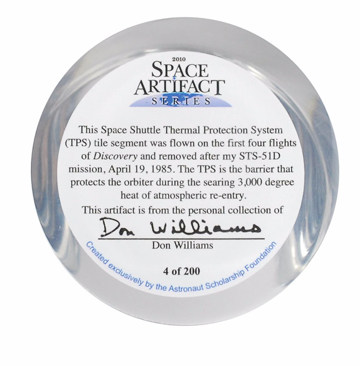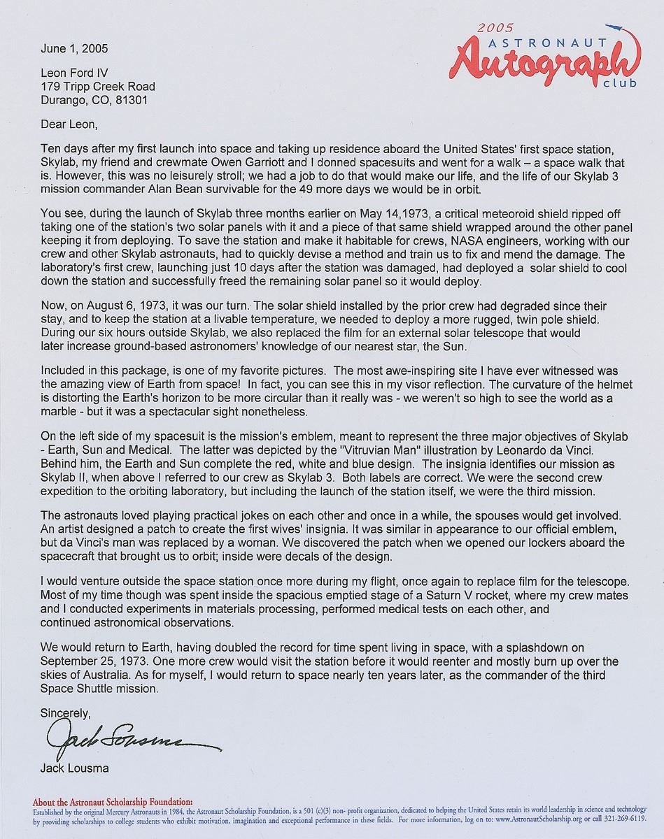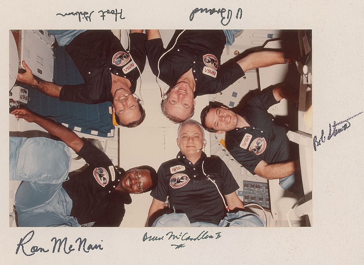 Large collection of over thirty items related to the Skylab and Space Shuttle programs, including: a flown Space Shuttle Thermal Protection System (TPS) tile segment flown on the first four flights of Space Shuttle Discovery, encased in a limited edition acrylic display numbered 4/200; a color semi-glossy 5.75 x 9 photo of the crew of STS–41–B, affixed to its original 8 x 10.75 mount, signed vertically on the mount in black felt tip, “V. Brand,” “Bob Stewart,” “Bruce McCandless II,” “Hoot Gibson,” and “Ron McNair”; five satin-finish photos of astronauts from the Apollo–Soyuz and Skylab missions, 8 x 10 and 10 x 8, each signed in black felt tip by the astronaut pictured, including Vance Brand, Owen Garriott, Paul Weitz, and Jack Lousma (2); an FDC signed in ink by Charles Conrad, Joe Kerwin, and Paul Weitz; an off-white card signed by Dale Gardner; six custom-made cards signed in ballpoint and felt tip by Space Shuttle crew members James D. A. van Hoften, Bob Stewart, Terry J. Hart, Owen K. Garriott, David C. Hilmers, and John M. Fabian; six Martin Marietta decks of playing cards featuring mission insignias; six commemorative coins; two commemorative pins; and three small swatches of flown payload bay liner affixed to presentation cards of various sizes. Also includes an off-white card with an autopen signature of Joe Kerwin. In overall fine condition. From the Leon Ford Collection.