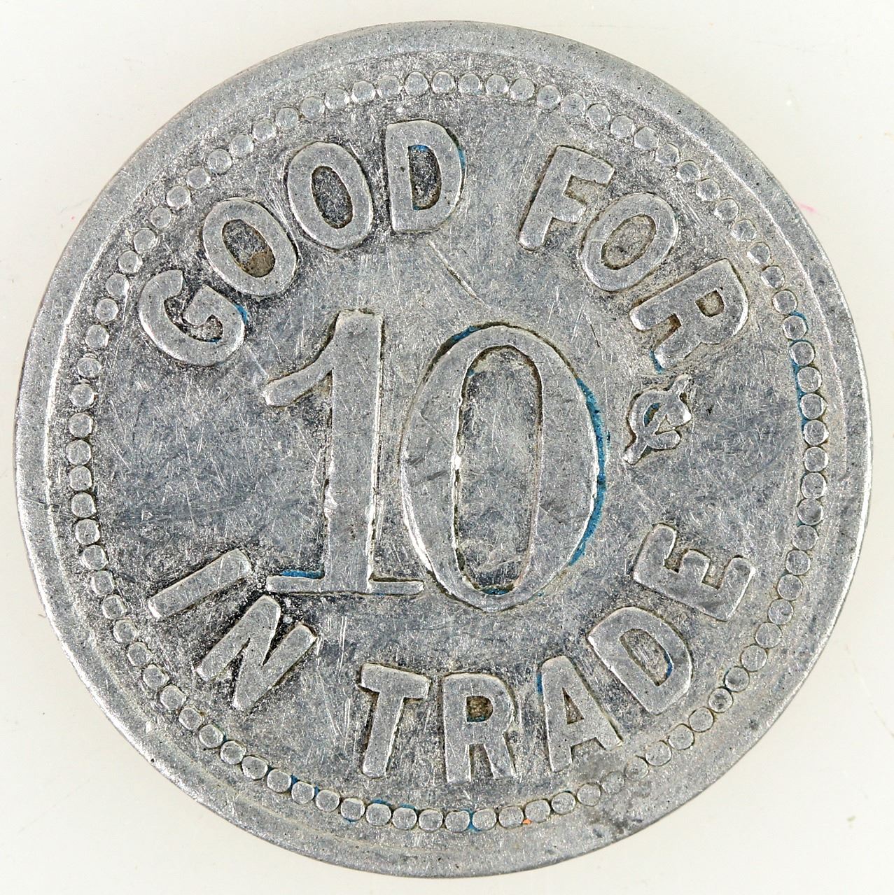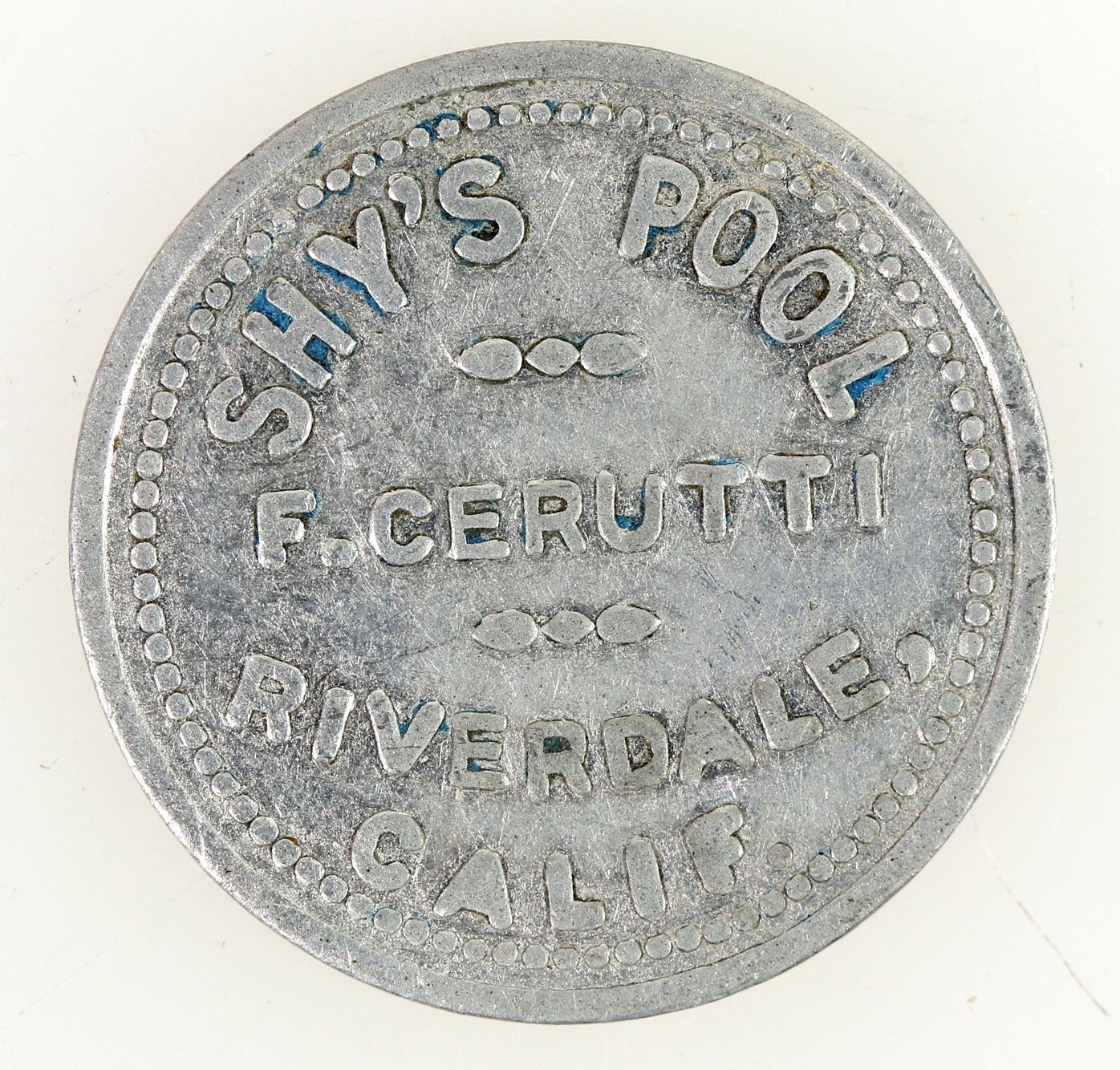 Rare Fresno County town of Riverdale: SHY'S POOL / F. CERUTTI / RIVERDALE. / CALIF. // GOOD FOR / 10c / IN TRADE; Al., rd., 22 mm.