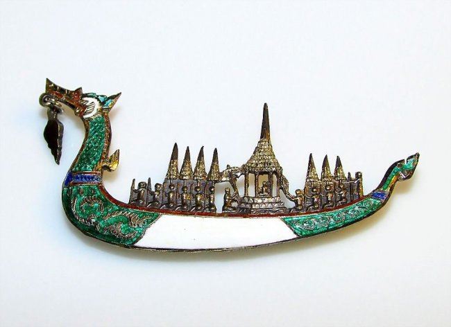For your consideration is this stunning vintage Siam sterling silver dragon boat with a gold wash. This beauty offers a beautiful design in sterling silver, accented with deep emerald and white enamel. The brooch measures 2 1/2" long and is in wonderful condition. Marked "Siam" and sterling on the back.