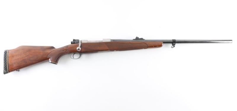 Custom sporter built on a Siamese Mauser action. Featured polished bare metal receiver & bolt body, other metal parts blued, 26" barrel drilled & tapped for front sight (sight not present), adjustable rear sight mid barrel, forward sling swivel mounted to barrel with Williams band, bent & slightly swept bolt handle, three position flag safety on cocking piece, walnut stock with right hand cheekpiece, ventilated rubber recoil pad, rear swivel, checkered panels with inset fleur-de-lis points at wrist & forend, black plastic grip cap. Receiver drilled & tapped across top (no scope base installed), polished with some original factory marks partially visible. Magazine follower has partially re-contoured bolt stop, but needs more re-shaping to truly allow bolt to close over an empty magazine. Bore is very good condition. Blued surfaces retain 75% coverage with handling marks, some light patina, grayish color on bottom metal. Stock is very good condition with good fit to metal. Barrel marked "G R DOUGLAS" and "XX" in oval. Condition is NRA Very Good *** C&R Firearm ***