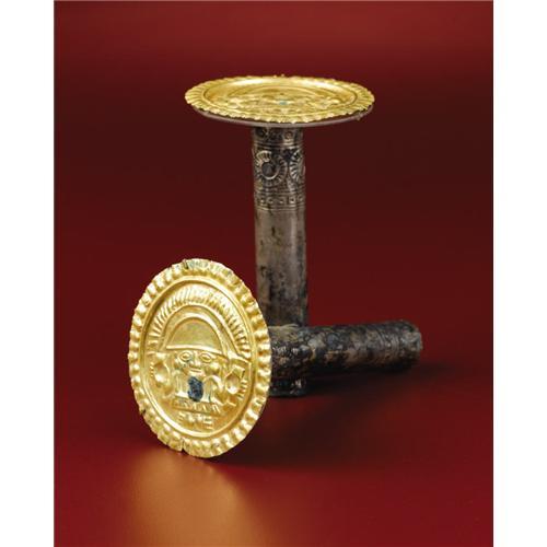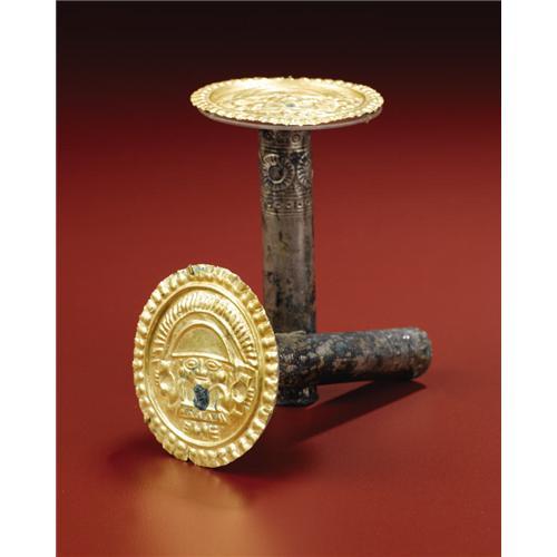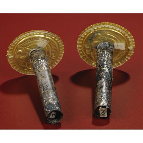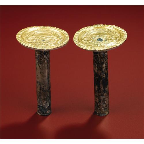 <B>Pair of Gold and Silver Earspools</B></I><BR>Sicán<BR>A.D. 700 - 1100<BR>Gold, silver-sheathed incised ear tubes<BR>(A) Diameter 2 1/8 in.<BR>(B) Diameter 2 1/8 in.<BR><BR>Comprising in all two gold repoussé disks and two silver tubular bars with incised designs, it is uncertain from surviving corrosion patterns whether or not the units were originally integral. The gold disks, one of which has a large splotch of cuprous corrosion adhering to the figure's torso, depict standing regal figures wearing large crescent-shaped headdresses and holding cups. They wear ear ornaments and tunics with zigzag borders. Closely-set lines radiate outward along the arcs of their headdresses. Outside a raised rim, a row of bead-forms with outwardly dependent elements borders the whole. The silver tubes have several rows of repoussé geometric designs bordering each end. Both silver pieces have considerable corrosion and an end piece is missing from one. A few further small corrosion spots are on the gold disks.<BR><BR>Provenance<BR>Splendors of the World, Haiku, Hawaii<BR><BR>