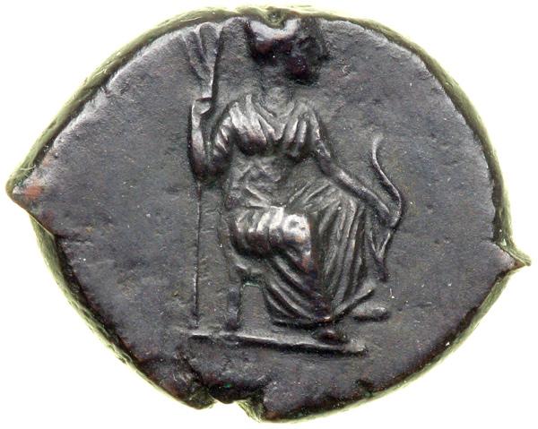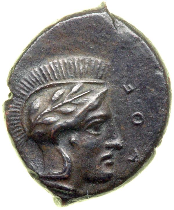Sicily, Athe…, c. 357-336 BC (or a bit earlier). AE 13 (Trias). Helmeted head right of Athena; ethnic. Reverse: Female figure seated right, holding trident and bow. Calciati III, 287, 3. Extremely rare. Even brown patina; beautifully detailed; Extremely Fine. .