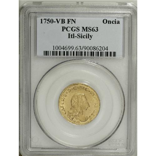 <B>Sicily. Carlo III gold Oncia 1750-VB FN, </B></I>KM-C14a, MS63 PCGS, full mint brilliance with adjustment marks on the bust and reverse edge. Despite the small minting flaws this is a very attractive example.<BR><BR><b>Shipping:</b> Coin/Currency (<a target="_blank" href="http://www.heritageauctions.com/common/shipping.php">view shipping information</a>)
