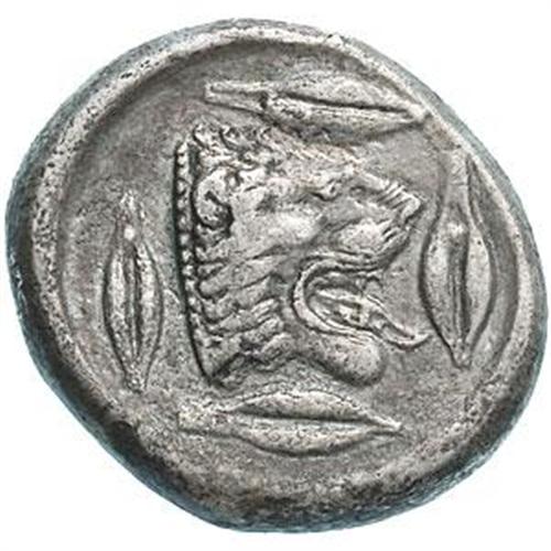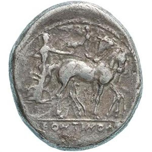 Greek Coins. Sicilia. Leontini. Tetradrachm, 475-466 a.C. D/ Quadriga al passo a destra, condotta da auriga che indossa lungo chiton. Sopra, Nike vola a destra e incorona i cavalli. R/ Testa di leone a destra. Intorno, quattro chicchi d'orzo. SNG ANS 204. gr. 16.67 R. AG. BB.