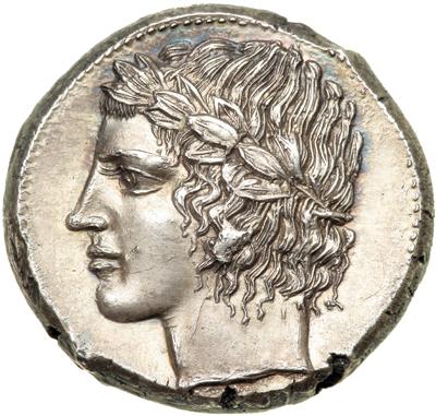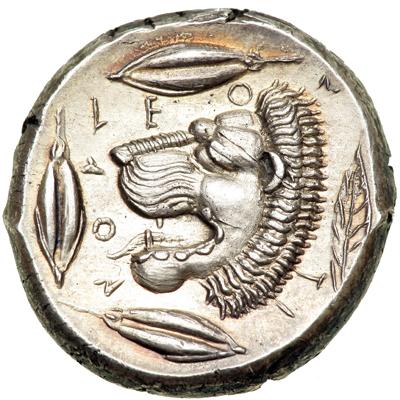 Sicily, Leontinoi, c. 430 BC. AR Tetradrachm (17.39 g). Laureate head left of Apollo. Reverse: Lion's head left with open jaws and protruding tongue, surrounded by three barleycorns and one bay leaf. Rizzo pl. XXIV, 4 (these dies); SNG ANS 257. This particular coin is free of the unsightly die-breaks and flatness often associated with this type. It has needle-like sharpness in the devices and is certainly one of the finest of the now exhausted hoard. Superb, Nearly Mint State.
