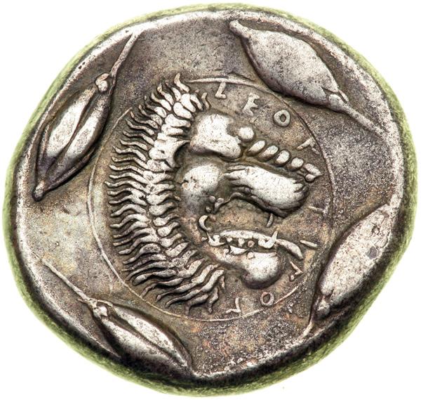 Sicily, Leontinoi, c. 455-430 BC. AR Tetradrachm (17.23 g). Laureate head left of Apollo. Reverse: Lion's head right with open mouth, enclosed by close-fitting, raised circle; around, four barley corns. SNG Lloyd 1060; Dewing 630v. Very Fine, and attractive. .