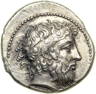 One of the classic types of ancient Greek coins. In 1944, Herbert Cahn enumerated only 51 tetradrachms of this type, all from the same obverse die, and utilizing five different reverse dies.