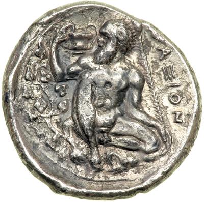 Sicily, Naxos, c. 420 BC. AR Tetradrachm (15.8 g). Classical head right of Dionysos, wearing stephane decorated with ivy wreath. Reverse: Squatting Silenos holding kantharos and thyrsos; to left, ivy vine. Cahn (Naxos) 100 (these dies; V66/R82); Naster (La Collection Lucien de Hirsch) 513; BMC 19; Dewing 663; SNG ANS 524. Very rare. Well detailed; porosity mainly confined to the reverse. About Extremely Fine/Very Fine.