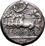 Sicily. Panormos, Punic Occupation.   Tetradrachm, circa 425-300 BC. Obv. Charioteer driving fast quadriga left, holding kentron in right hand, reins in left; above, Nike flying right, crowning charioteer; Punic 'SYS' in exergue. Rev. Wreathed head of Arethusa left, wearing triple-pendant earring; four dolphins swimming around. Cf. Jenkins I 66/67. Cf. SNG ANS 540. SNG Lloyd 1586. AG. g. 16.85  mm. 24.50  R.  Good VF+. Rare. Pleasant light old cabinet toning.  Mondo Greco. Sicilia.Panormos, Occupazione Punica.     Cf. Jenkins I 66/67. Cf. SNG ANS 540. SNG Lloyd 1586. AG. g. 16.85  mm. 24.50  R.