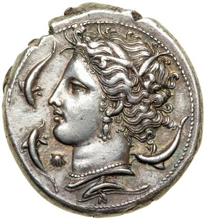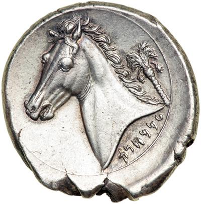 Sicily, Siculo-Punic Coinage. Circa 320-310 BC. AR Tetradrachm (17.12g), "People of the Camp". Head left of Tanit-Arethusa, crowned with reeds and wearing pearl necklace and triple-pendant earring; beneath chin, scallop shell; around, four dolphins. Reverse: Horse's head left with date palm behind. Jenkins (SNR 56) series 3a, 163 (O49/R132). Toned; Extremely Fine.