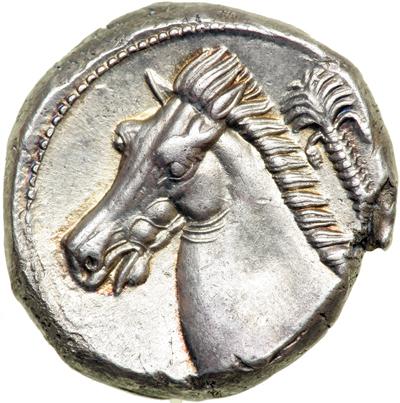 Sicily, Siculo-Punic Coinage, c. 300-290 BC. AR Tetradrachm (16.8 g). Head right of young Melqart/Herakles wearing lion's skin. Reverse: Head and neck of horse left; behind, palm tree. Cf. Dewing 983; cf. Boston MFA 499; cf. Jenkins (SNR 57). Clear horse's eye on reverse. Choice Very Fine.