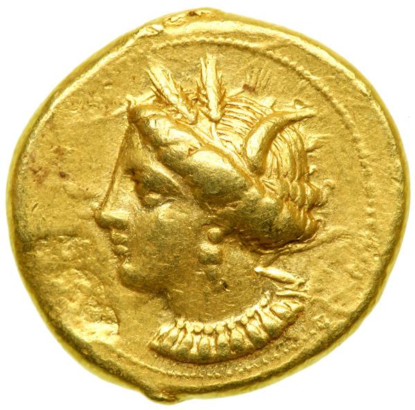 Sicily, Siculo-Punic Coinage, c. 335 BC. Gold Stater (9.39 g). Bust left of Tanit (Persephone) wreathed with grain, wearing necklace and triple-drop earring. Reverse: Horse standing right on exergual line; in lower right field, three pellets. Cf. Jenkins & Lewis group III f (these dies not shown); Müller 45. Flan flaw in left obverse field. Choice Very Fine with a particularly attractive reverse. .
