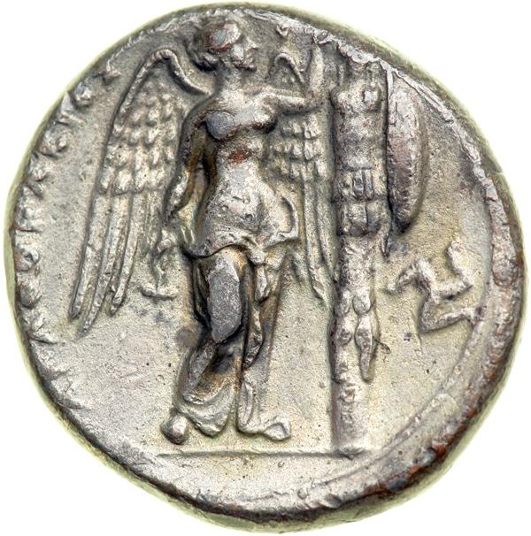 Sicily, Syracuse. Agathokles, 317-289 BC. AR Tetradrachm (18.56 g!!!). Wreathed head right of Arethusa wearing pendant earring and necklace. Reverse: Nike standing facing before trophy; in right field, triskelion. SNG ANS 667. A few areas of purplish silver chloride. Beautiful style; About Extremely Fine.
