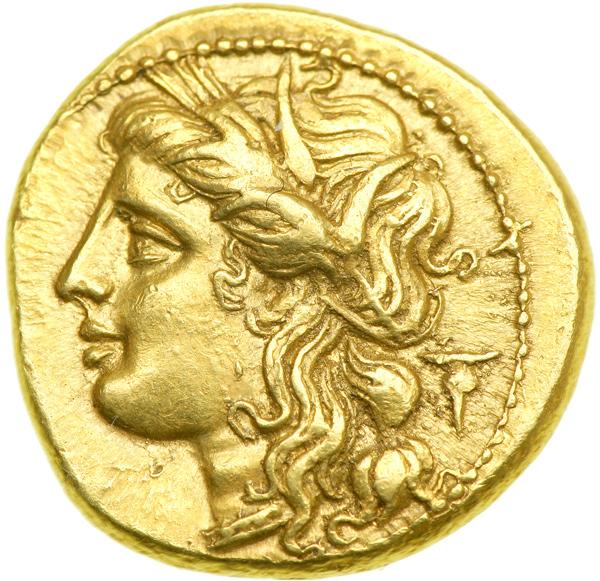 Sicily, Syracuse. Hieron II, 275-215 BC. Gold Drachm (4.24 g). Head left of Persephone wreathed with corn; behind, bukranion. Reverse: Galloping biga driven left by female charioteer holding goad. SNG ANS 865; SNG Cop 818; BMC 510. Extremely Fine. .