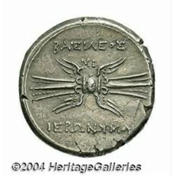 Sicily, Syracuse. Hieronymous. 215-214 B.C. AR 10 litrai (22 mm, 8.34 g). Diademed head left / Winged thunderbolt; MI above. Holloway 6b (O5/R5); SNG ANS 1025-6. Toned, good VF. Important notice: Heritage usually auctions material at the rate of 200-250 lots per hour. On some occasions eBay Live bid software or the Internet may not be able to keep up with the pace of the auction. We recommend placing a realistic absentee bid now as insurance to avoid disappointment. Occasionally the auctioneer may eliminate or reject an eBay Live bid, and the auctioneer may also reopen a lot after the close of the eBay live bidding (usually because we missed an audience bid), and may reject your bid even if it shows you as the winning bidder. By bidding via eBay Live, you agree that Heritage may award the lot to another bidder at its sole discretion under the circumstances described above or any other reasonable circumstances. Also please note that all Heritage lots purchased through eBay Live carry a 20% Buyer's Premium. Please make sure you read the Terms and Conditions before you bid.